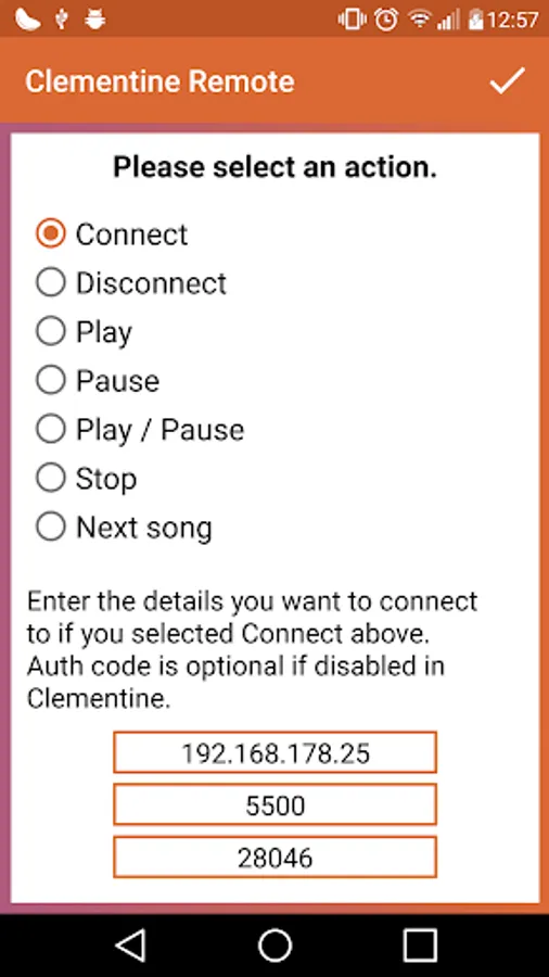 Help: https://github.com/clementine-player/Android-Remote/wiki