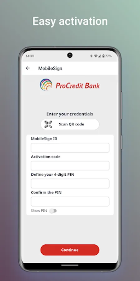 Use the ProCredit MobileSign app to securely access ProCredit’s banking applications and services. Use it to authorize transactions or to authenticate your access (when requested). Please note that MobileSign is primarily a security application and is used in conjunction with other ProCredit applications, not stand-alone.
