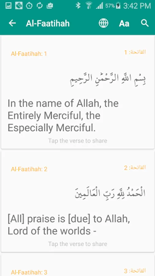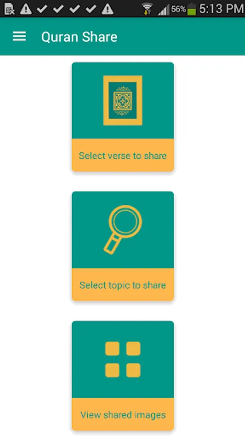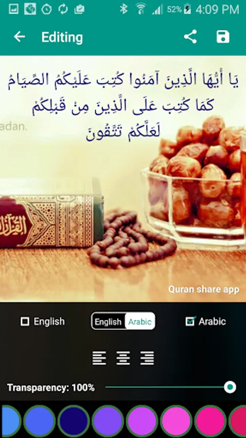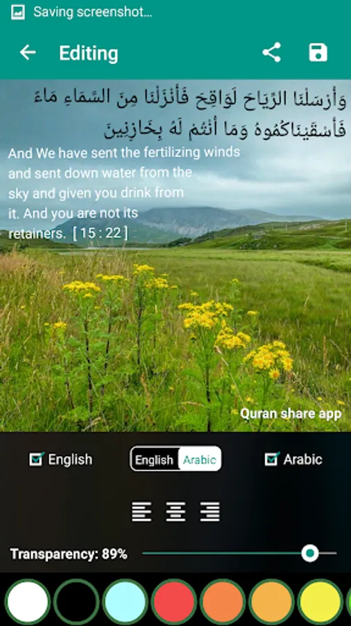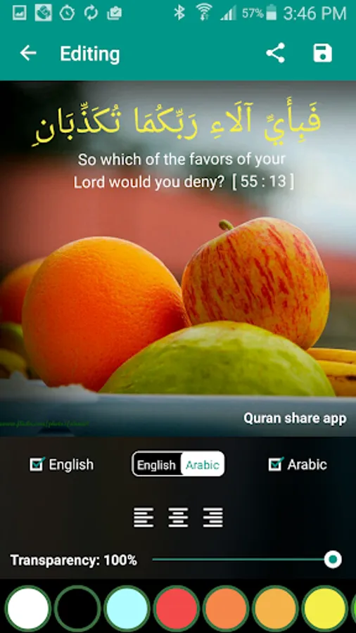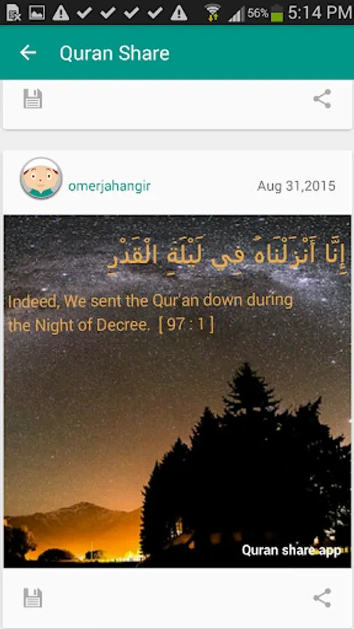 Quran Share allows you to share a verse from the Quran in an aesthetically pleasing design. You can select a verse by browsing through the different chapters of the Quran or by searching for a verse through the topic index. Then you can search for a picture on flickr by any keyword (like mountain, prayer, trees). Once you have selected the picture, you can then overlap the verse onto the picture and adjust the color, size, alignment of text over the picture. Once satisfied with your design, simply share the picture through facebook, whatsapp, twitter, email or any other social networking site.