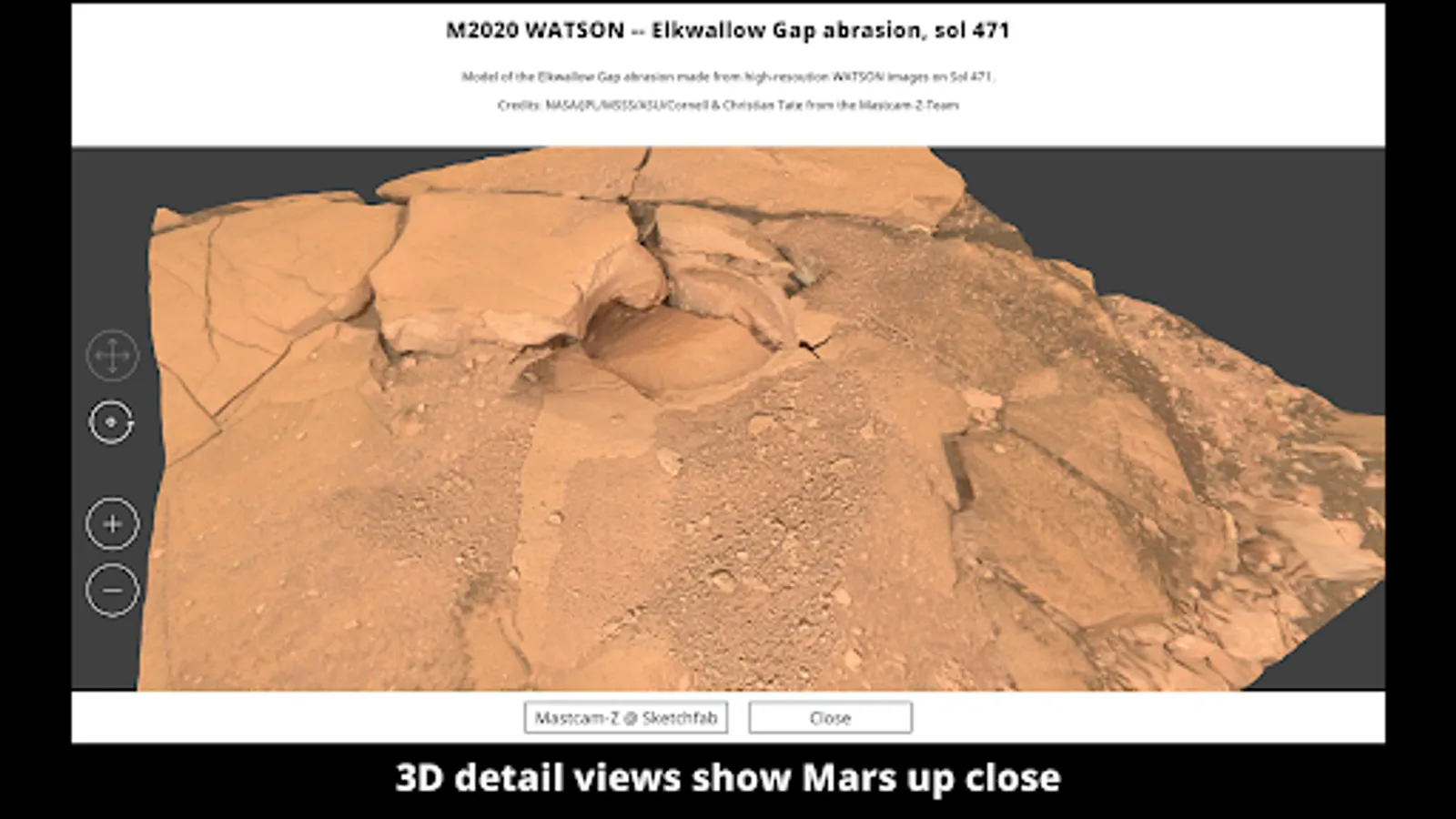 Since version 0.7 there are now impressive detailed views created from the photos of Percy and Ingy using photogrammetry. Look at the stones and rock formations as if you are right there on Mars! These great detailed views have been integrated into the M2020 history list.