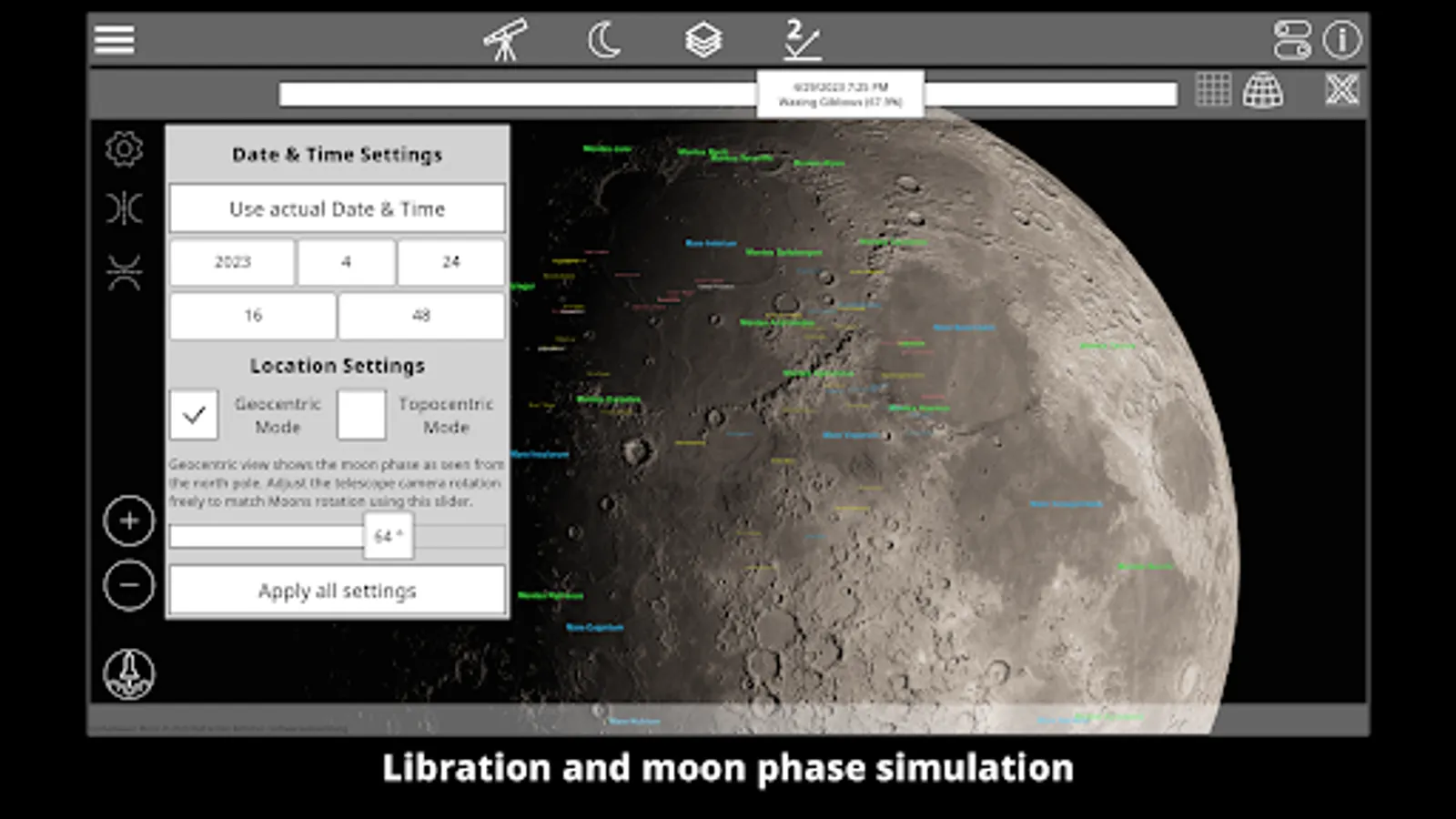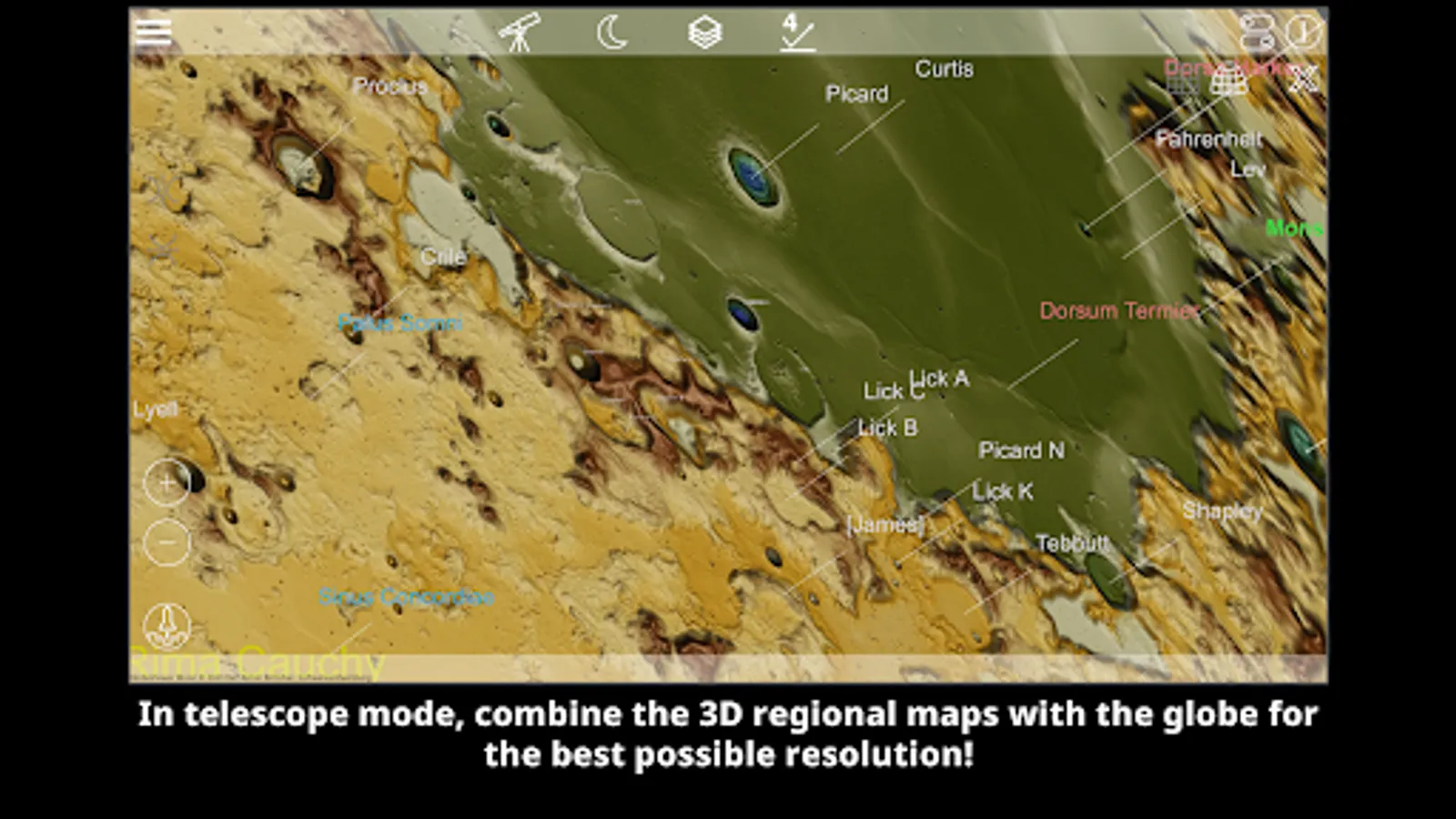 The lighting in the 3D map view is designed in such a way that the light can be directed into the crater from all directions. This is used to improve the visibility of height structures in the craters and is not intended to represent the real lighting situation. Realistic lighting that includes the ecliptic was also dispensed with in the globe view in favour of the visibility of the polar regions. In telescope mode the lighting is a realistic simulation including Moon phase and libration movement. So the app becomes a useful tool for telescope users.