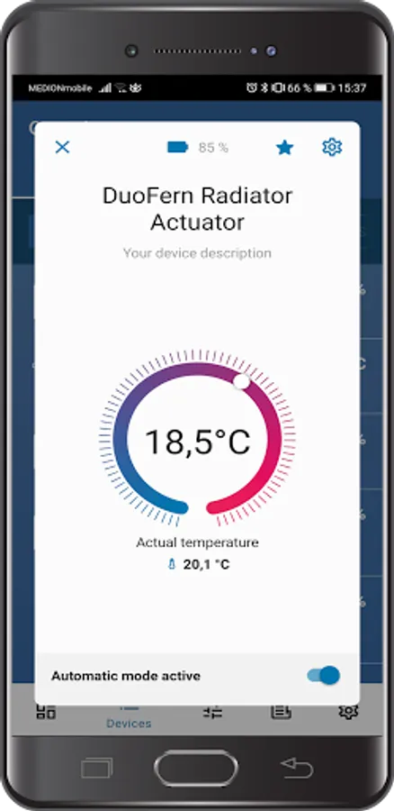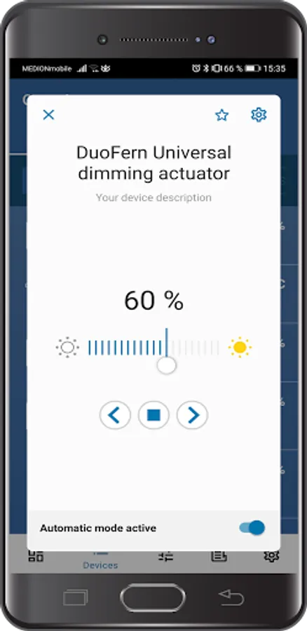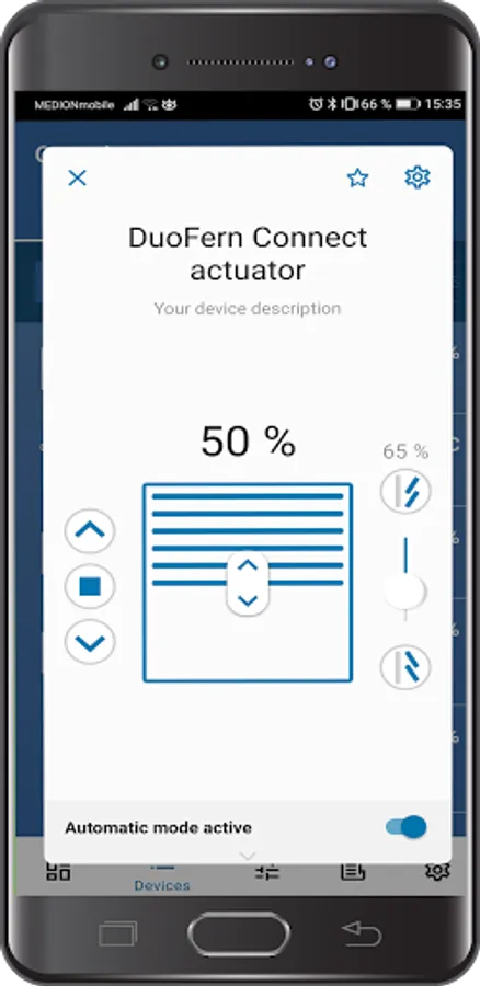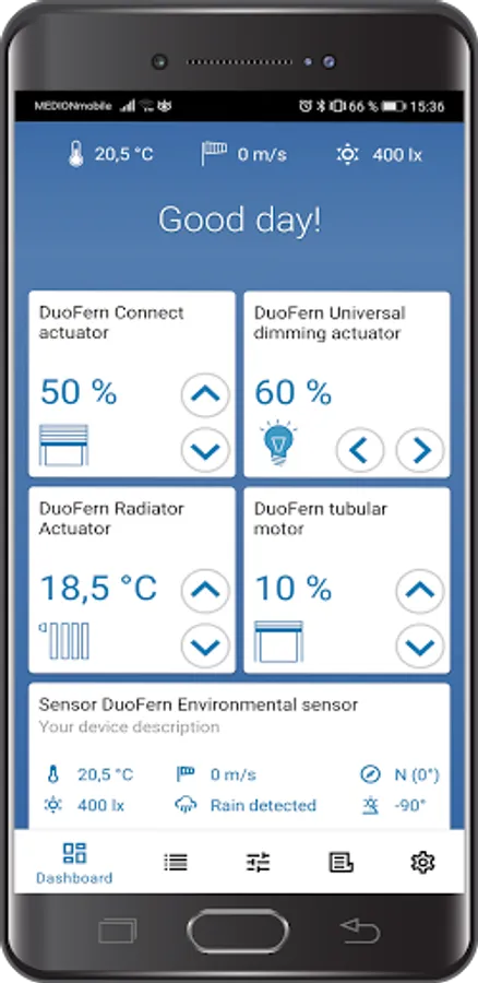 You can arrange your favorite devices of the Rademacher SmartHome system clearly in the dashboard - the start page of the app - and have the most important information at a glance. This also applies to sensor data such as temperature, sun direction and wind speed, or activated and deactivated automations and status messages. In addition, the app offers user-friendly and intuitive operating elements, for example a thermostat rotary control or the roller shutter control element, which can be moved from top to bottom like the curtain.