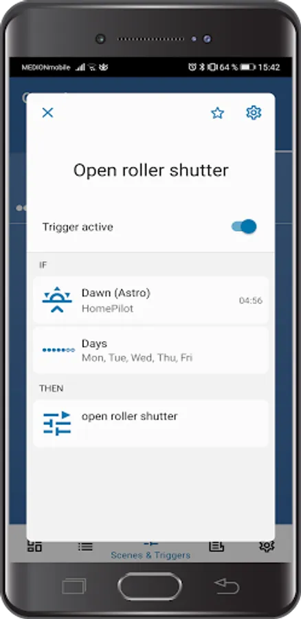 Another special feature of ours: "Triggers" can be created separately from a scene. If a previously defined trigger occurs - for example, if the temperature reaches a certain level or if the environmental sensor should respond to rain - it either activates an associated scene or just sends a push message for information without triggering an action.