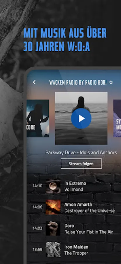 The whole W: O: A world in one app: Here you get the music from over 30 years of Wacken Open Air! All the bands that have ever stood on one of the stages on the Holy Ground run here in the program - for that Wacken feeling around the clock. A radio app from RADIO BOB! and the Wacken Open Air for all festival goers and metalheads out there.