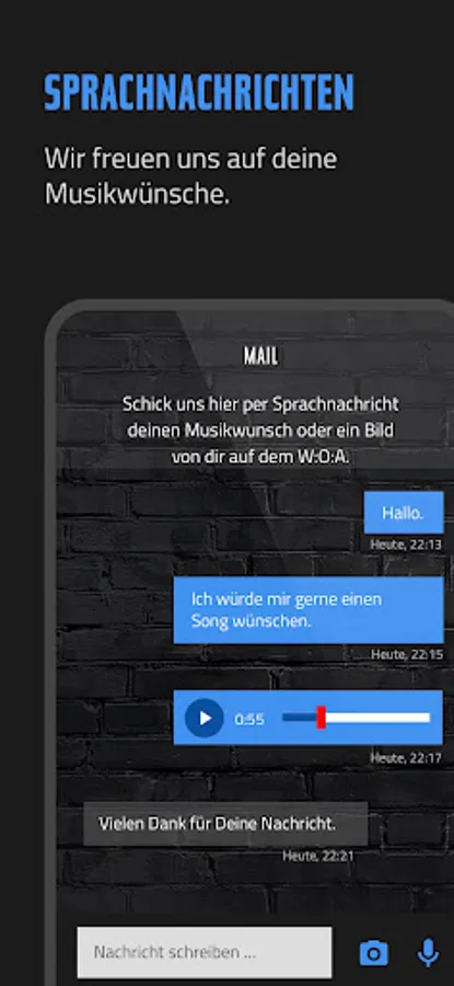 The Wacken Radio by RADIO BOB! provides you with the latest metal and W: O: A news, articles from the history of the legendary metal festival and the bands of the scene - and fulfills your music wishes. As? Via the message and voice message function of the app: Simply send your song request via voice message and we will play it in the program!