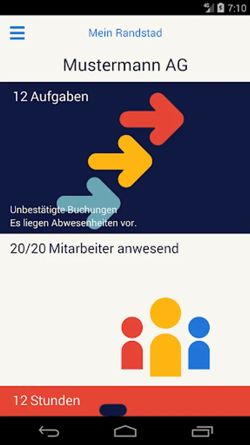 In the Randstad Portal app, the electronically recorded time data is displayed transparently and clearly in real time. In a protected environment, you can see the current presence and absence status around the clock, as well as a precise overview of the weekly working hours already worked by all employees.