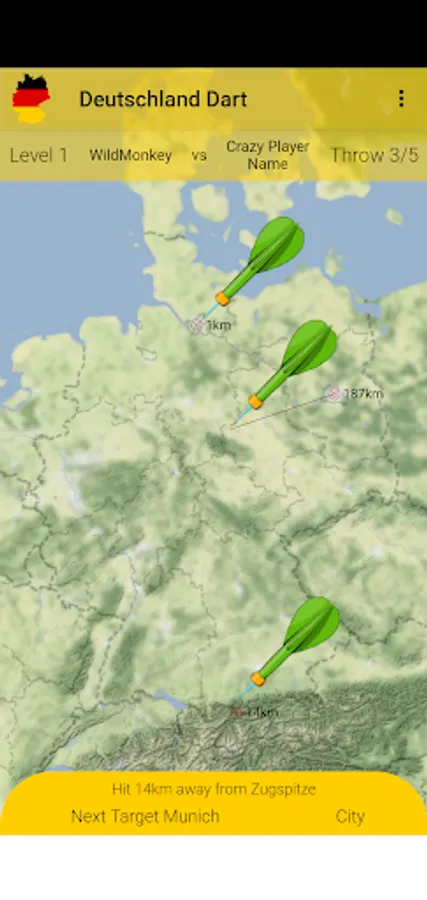 Where are cities, mountains, landmarks and interessting places in Germany? Aim exactly to throw the dart at the target. The closer you get, the more points you get when playing against a friend. With this game you also learn german geographics of Germany.