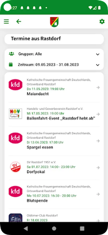The Rastdorf App offers a comprehensive overview of all the dates of the clubs, groups and associations from Rastdorf and the joint municipality of Werlte in Emsland. With just a few clicks, you can select your group and desired time period and view the on-site appointments at each location.
