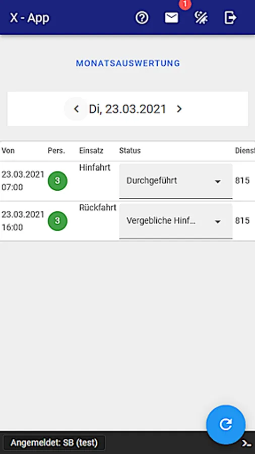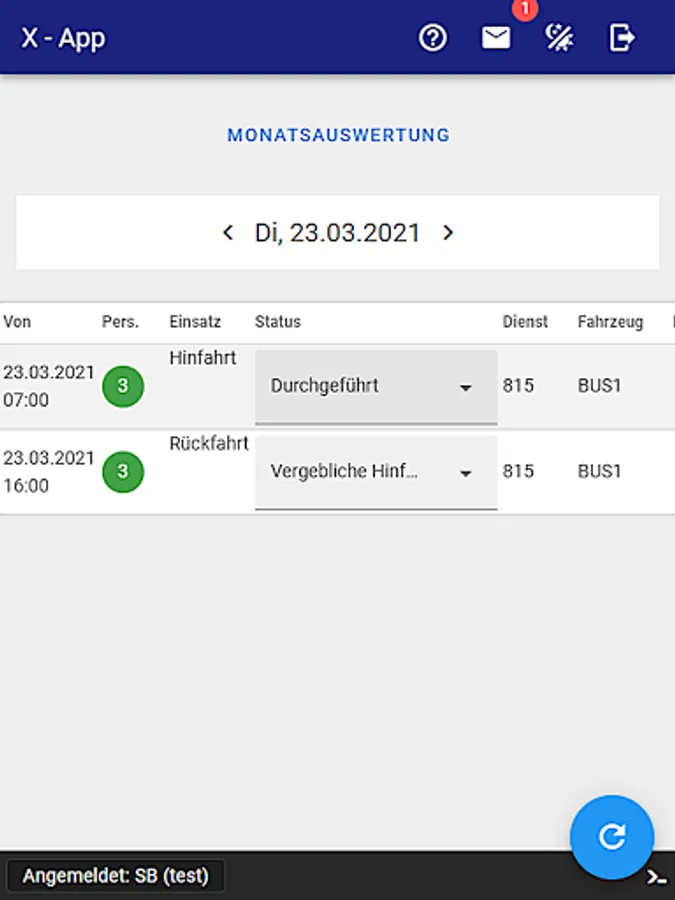 With a selection box he is able to assign a status for the respective trip. The options: "carried out", "unsuccessful outward journey", "unsuccessful return journey", "canceled" are possible.