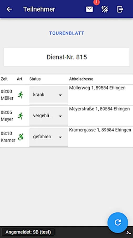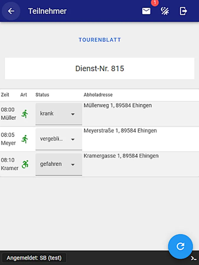 In addition to the information on whether the person is in a wheelchair or a runner, all relevant data for the transport can be viewed. A tour sheet for this trip can also be generated using a separate button.
