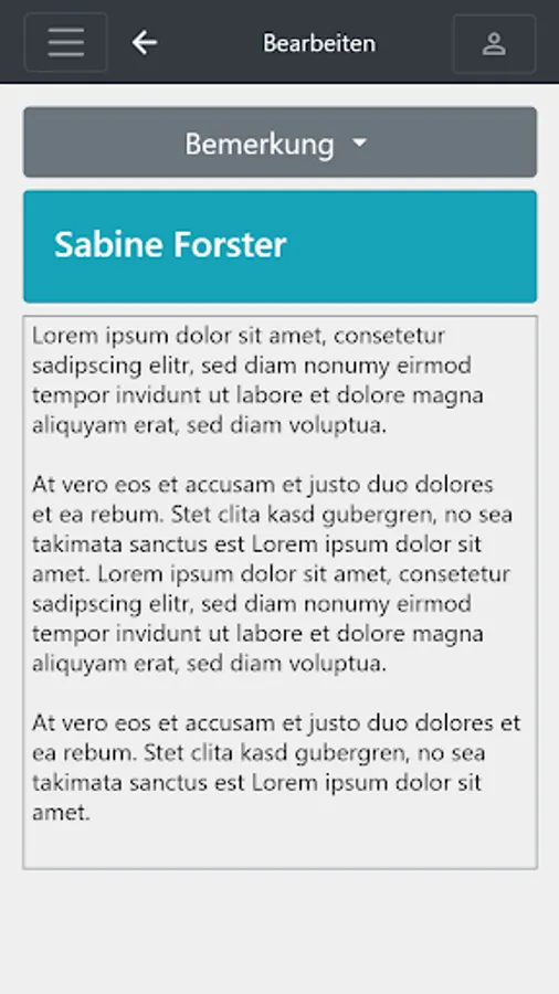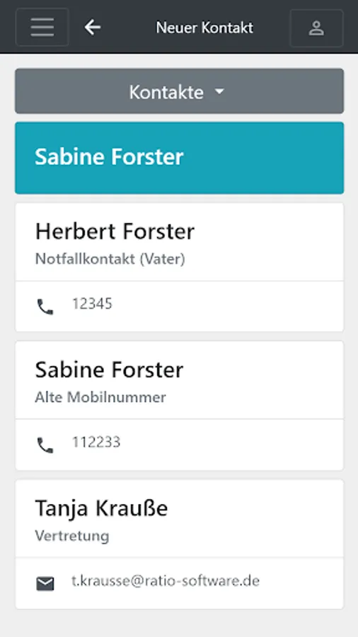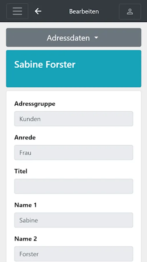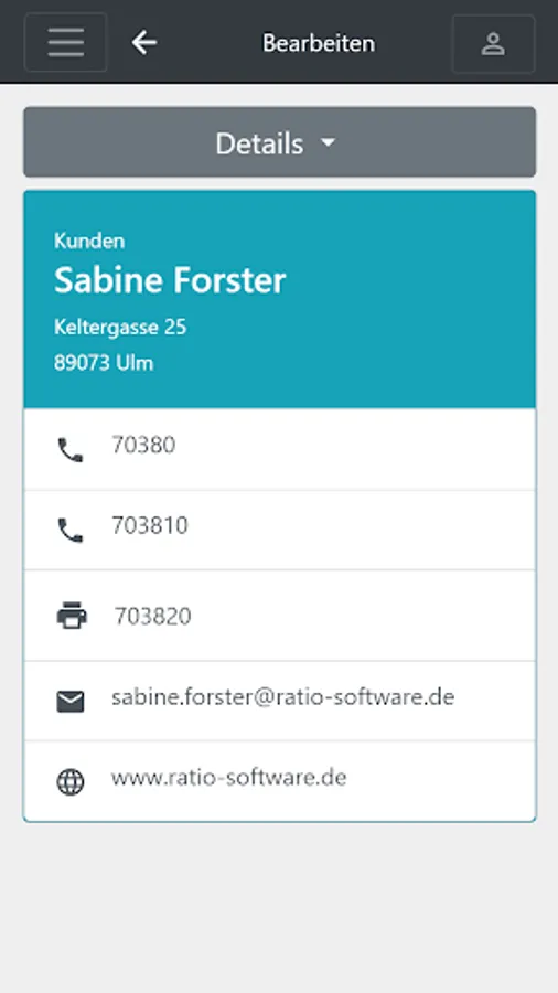 Click on a search result to go to the detail view. There you will find all the important information such as name and address, telephone and fax numbers, e-mail and Internet address and comment and further contacts. All information can be edited directly in the app and stored in the database.
