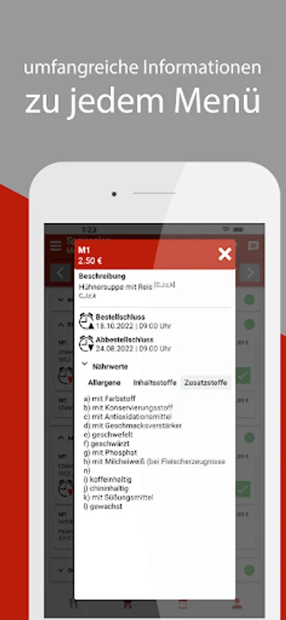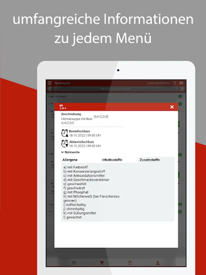 Additional information can be displayed for each menu: allergens, ingredients and additives, nutritional values.