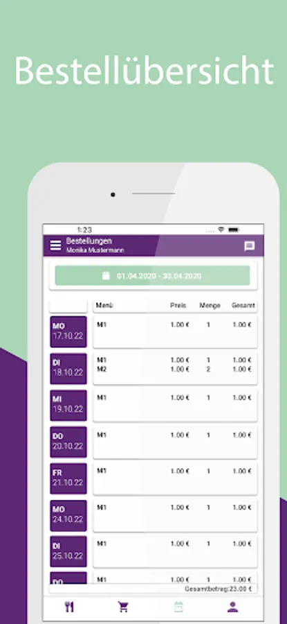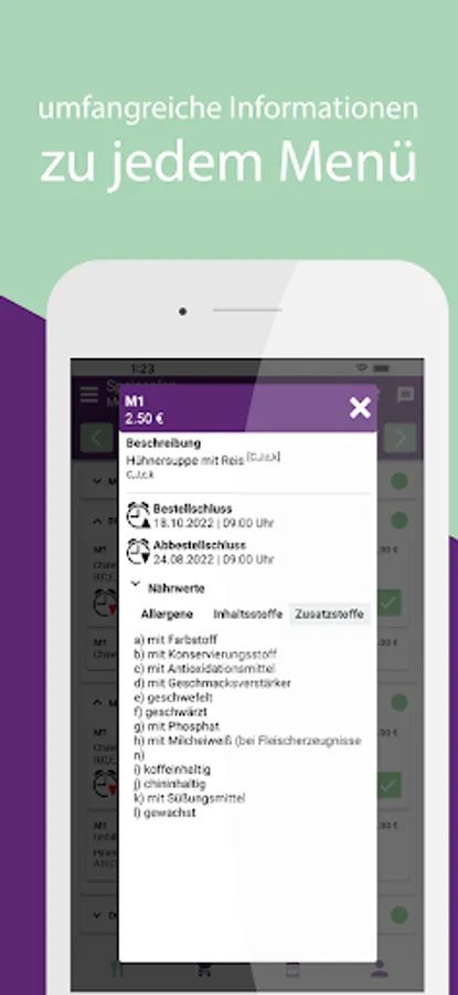 You have a customer-focused meal plan view (day or week view) and a detailed view of the menus in terms of prices, allergens and additives available.