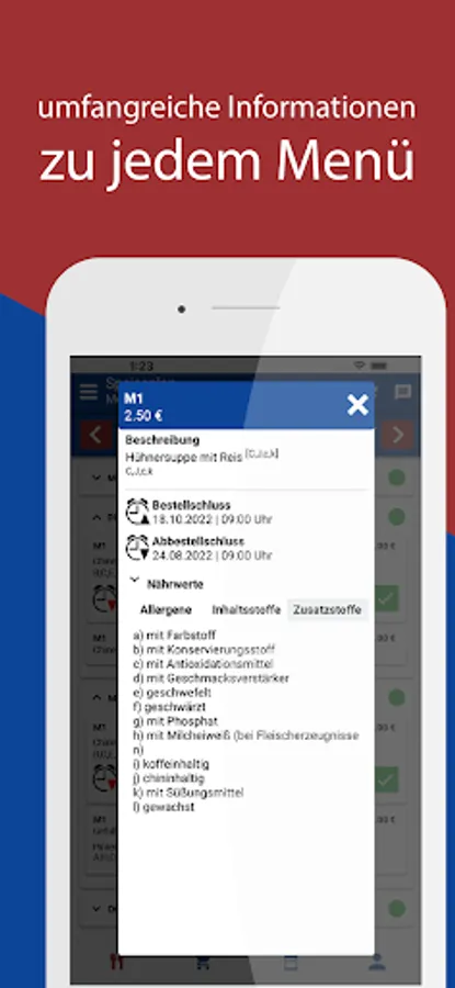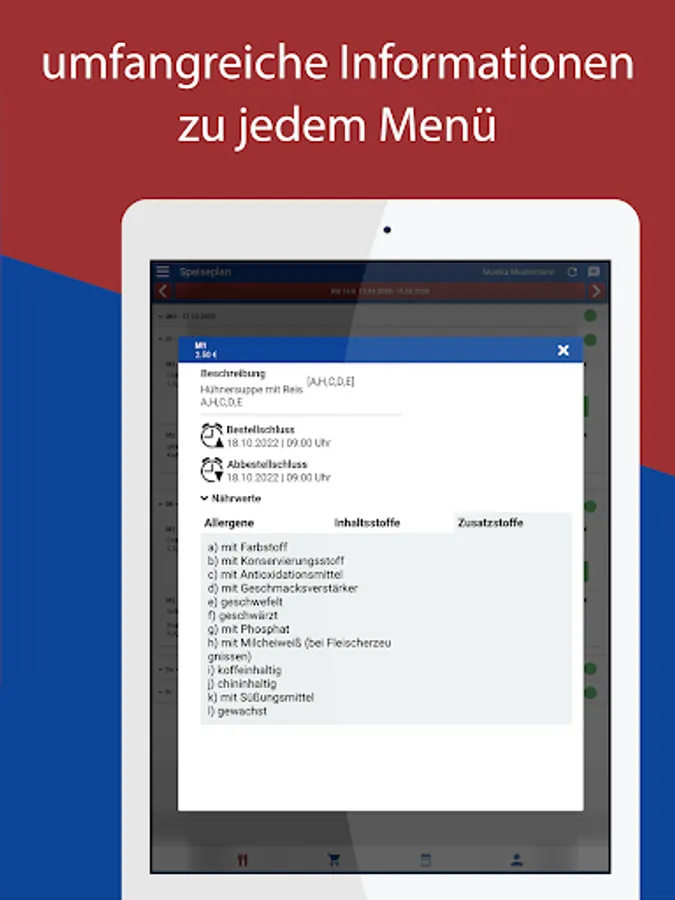 Additional information can be displayed for each menu: allergens, ingredients and additives, nutritional values.