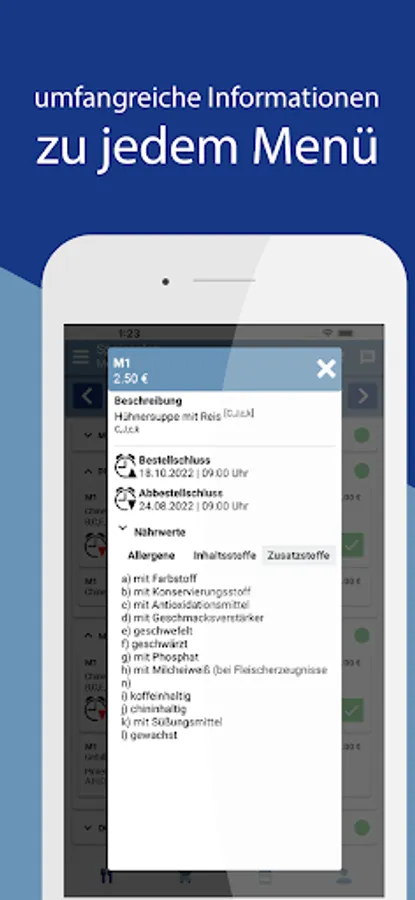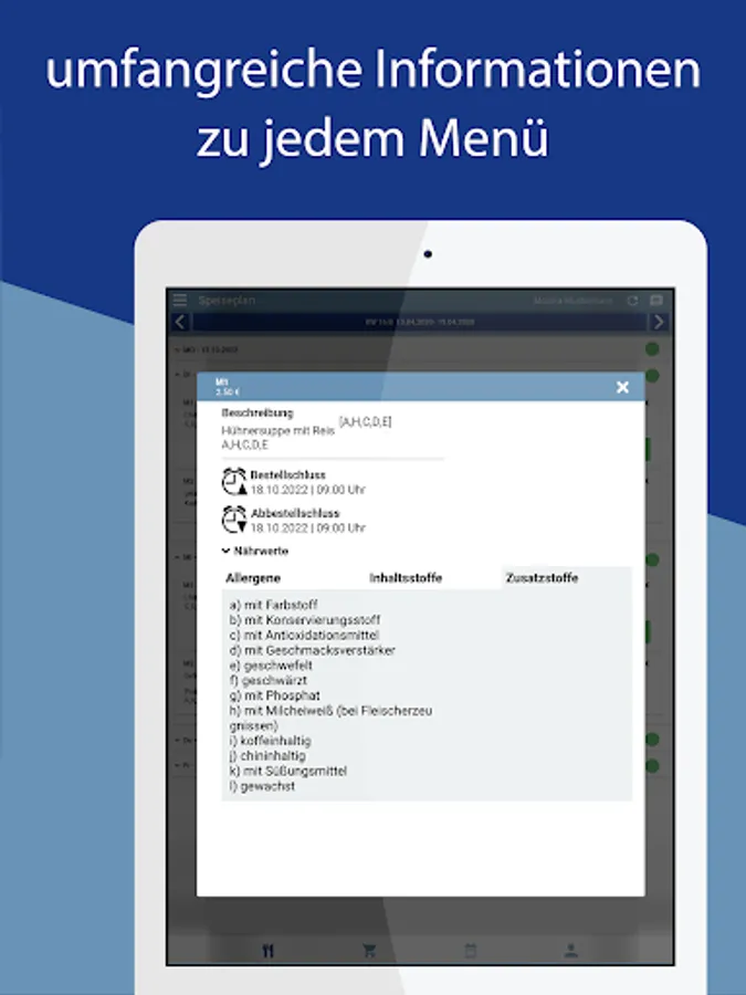 Additional information can be displayed for each menu: allergens, ingredients and additives, nutritional values. In the settings, it is possible to set a warning directly in the menu for particularly important allergens, ingredients and additives.