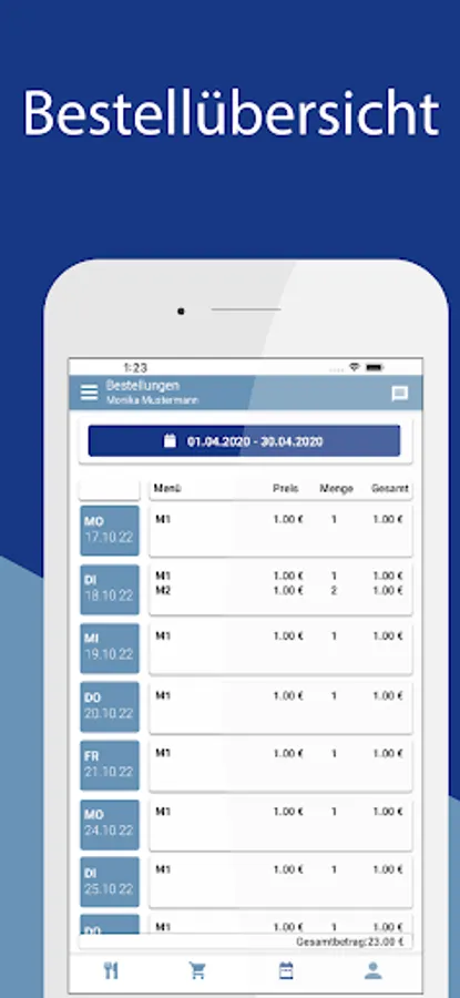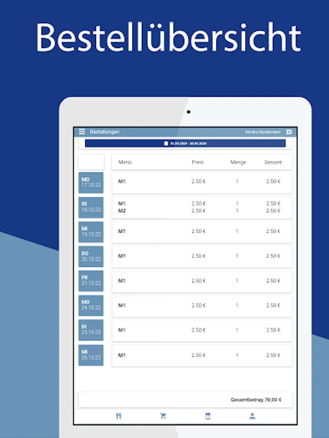 Registered meal participants can see the order service of the Tangiermen des Lebenshilfe e. V. their daily menu and their current meal orders are highlighted in color. The menus can be displayed in the menu in a daily and weekly view and can be adjusted in the settings to suit individual needs.
