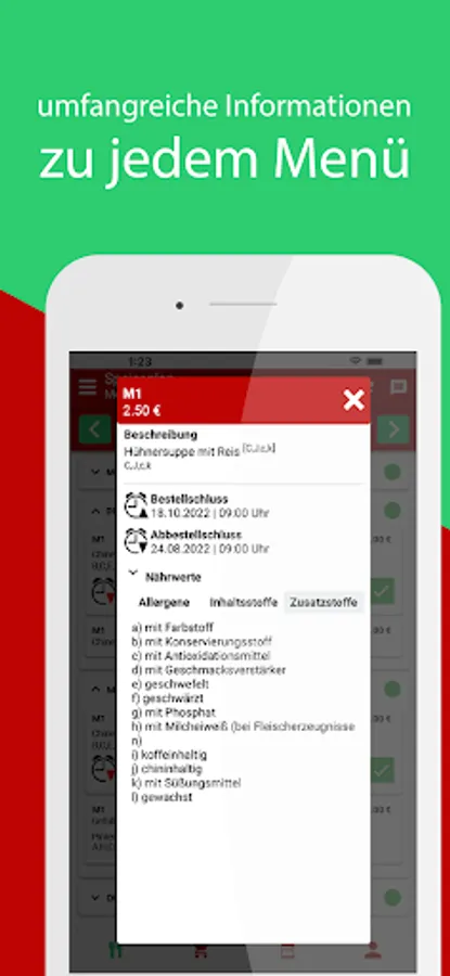 Additional information can be displayed for each menu: allergens, ingredients and additives, nutritional values.