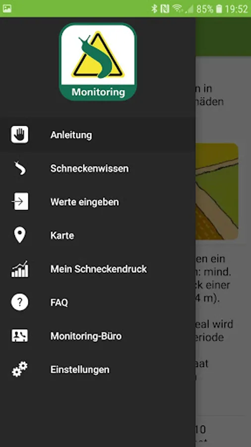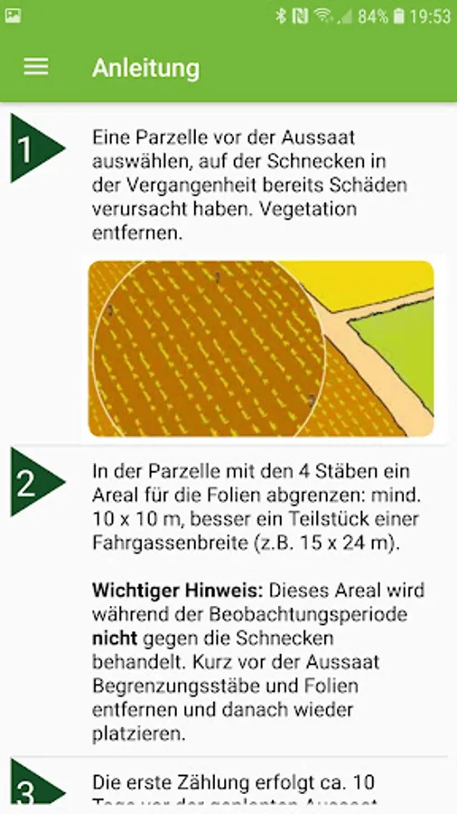 The monitoring starts ten days before sowing. In the initial setup of the app just entering the zip code area is required, another location of the site will not occur. The regular collection of worm infestation is carried out 2 times a week, each in six steps with limited number of entries or selection of response options.