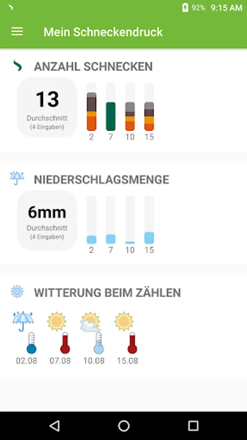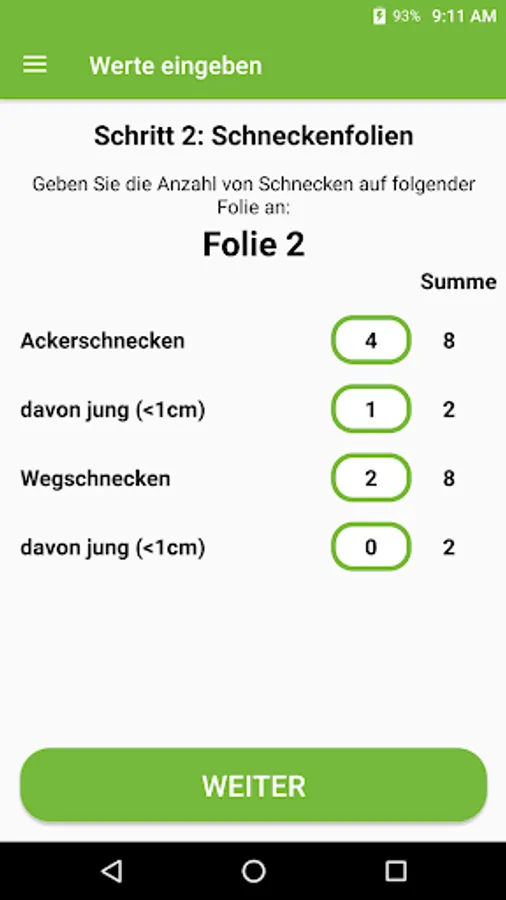 You decide whether you want to capture the worm differentiated among the four screws films by major types (arable or slugs) or only give the number of snails. In addition, the rainfall and the development stage of the crop must be given. Further information, such as to weather or insect damage, are voluntary. If there are feeding damage, you can document as a photo and send it to the monitoring office it using the app.