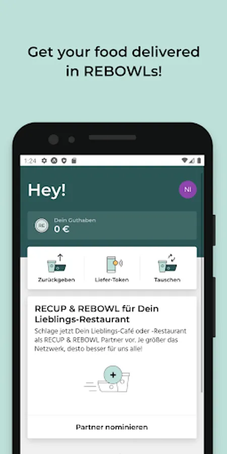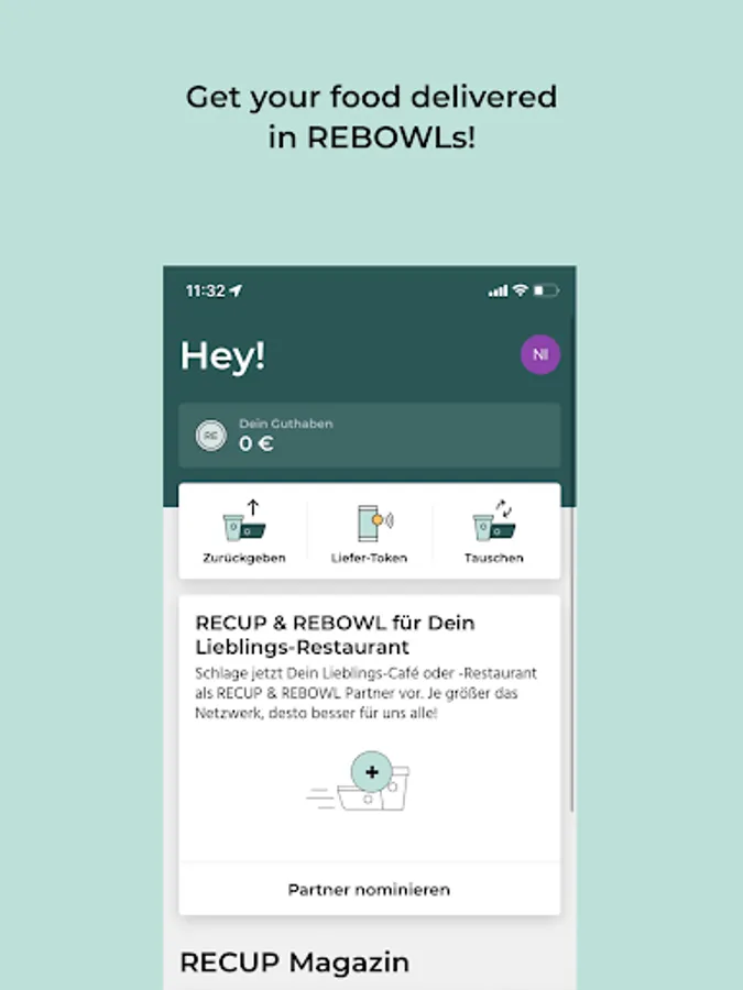 The RECUP & REBOWL app for customers gives you an overview of the cafés, restaurants, etc. where you can actively save packaging waste with the RECUP and REBOWL deposit system. You can also use the app while ordering from selected Lieferando & Uber Eats partners to receive your food in REBOWLs. Is your favorite restaurant not yet part of the REvolution? Then nomminate it via the app!