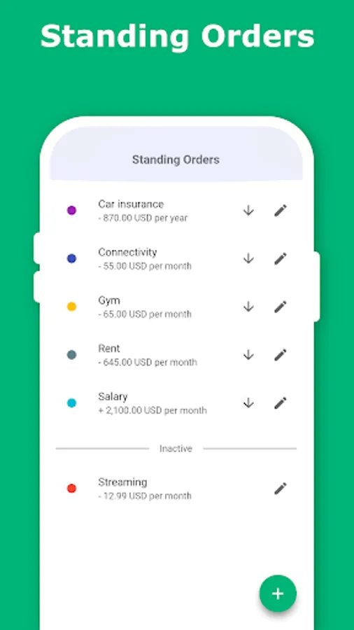 Because you don't want to enter your salary or the membership fee for your gym every month, we have added the possibility to create standing orders. These then automatically create entries in the time intervals you specify. Furthermore, you can pause, delete, or edit these standing orders, just as your financial situation demands. An additional bonus: Monthly shows all your standing orders in one list so that you never forget any subscriptions.