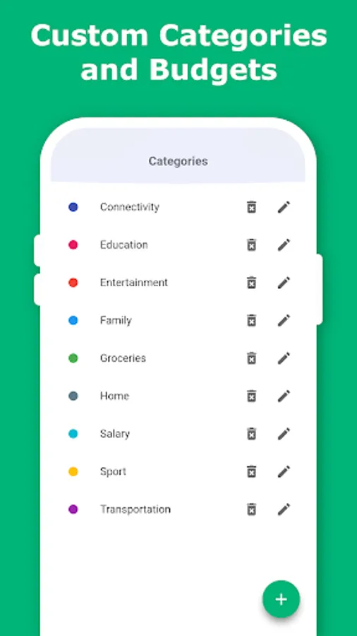 To organize your incomes and expenses, you assign them to categories. We have already added a few of the most common categories but of course you can edit and delete these, or add your own. Additionaly, you can assign a monthly budget to each category. Then you can see directly on the main page how much money you have left for certain things.