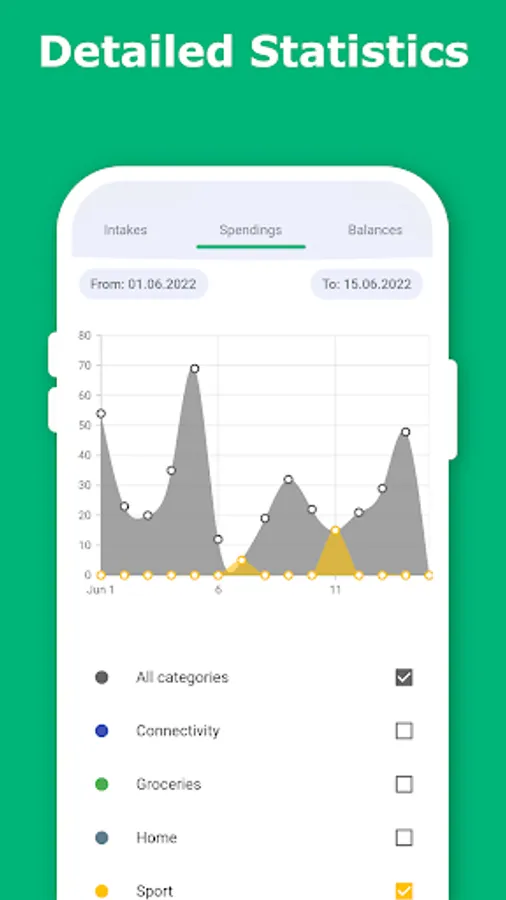 This app features a separate page for more detailed financial analyses. Here, you can bring your finance management to the next level. Track your expenses, incomes, and account balances over any desired timespan and check which expenses have the greatest influence on your finances.
