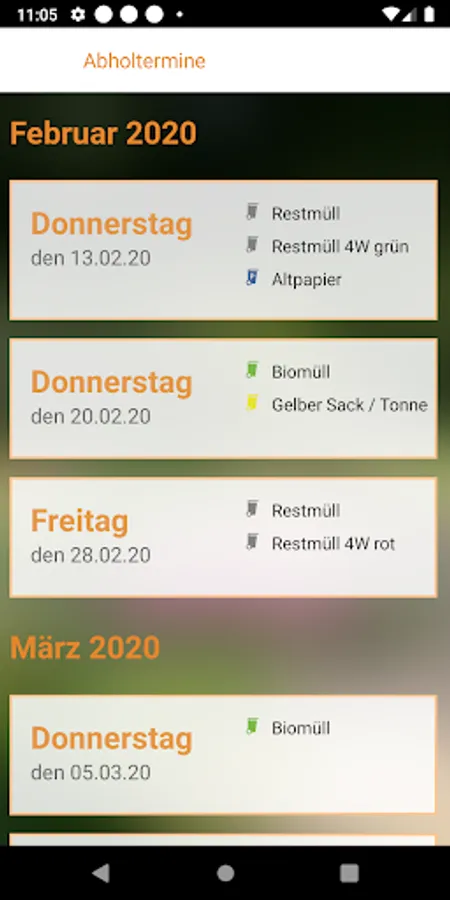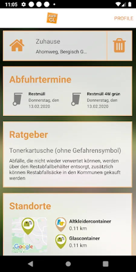Which material can be disposed of when, where and how? The abfallapp enables quick access to the individual collection dates. You will be reminded of all appointments for a maximum of five locations after previous setting. The personal locations are selected in the profile. A slider is used to set which disposal dates of a certain resource should be informed.