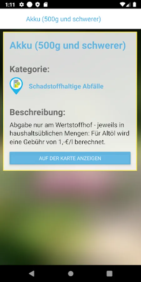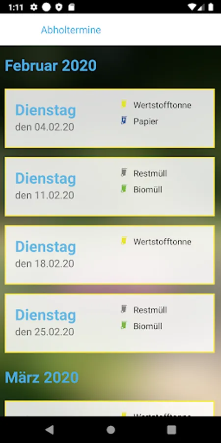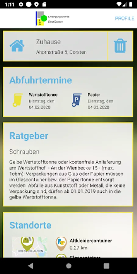 Which material can be disposed of when, where and how? The abfallapp enables quick access to the individual collection dates. You will be reminded of all appointments for a maximum of five locations after previous setting. The personal locations are selected in the profile. A slider is used to set which disposal dates of a certain resource should be informed.