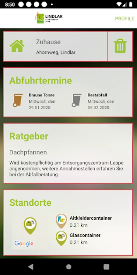 Which recyclable material can be disposed of when, where and how? The abfallapp Lindlar allows you quick access to the individual discharge dates. All appointments, even for multiple locations, can also be loaded into your calendar. Other features include: