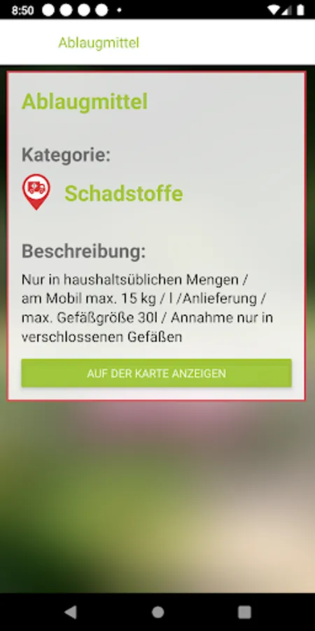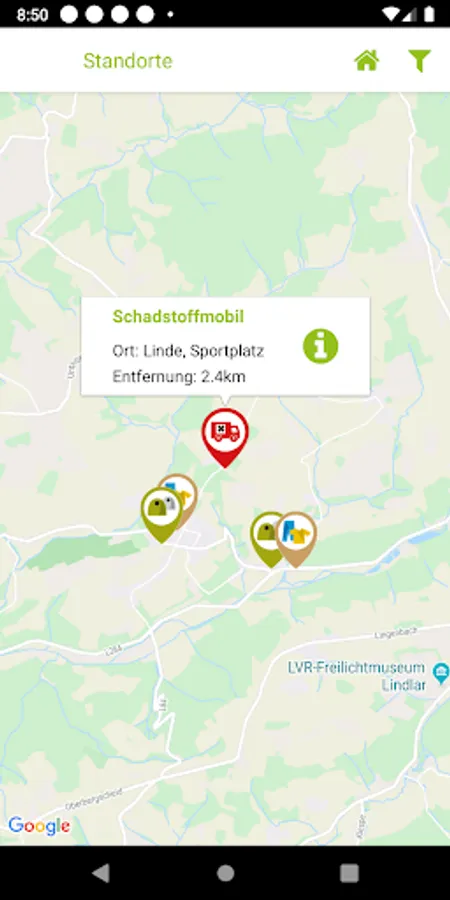 • an overview of all disposal locations (glass containers, recycling yard, etc.) with opening hours and a routing function