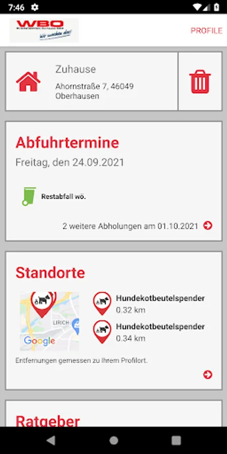 If some garbage cans (green, blue, yellow or brown) are not displayed in the app, please email app@wbo.oberhausen.de directly. Your request will be processed there as quickly as possible. Important: Please also inform colleagues in your email about your street and house number so that they can allocate the appropriate container.