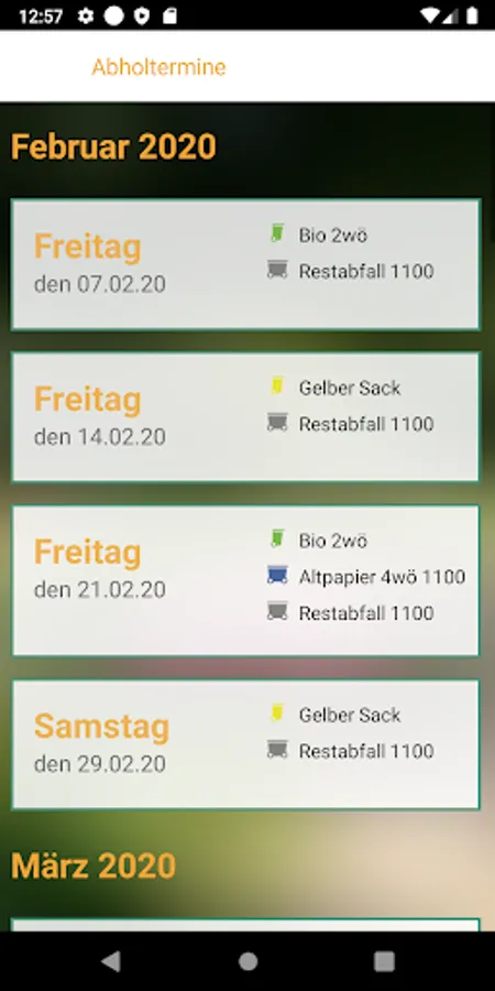 Which material can be disposed of when, where and how? The abfallapp enables quick access to the individual collection dates. You will be reminded of all appointments for a maximum of five locations after previous setting. The personal locations are selected in the profile. A slider is used to set which disposal dates of a certain resource should be informed.