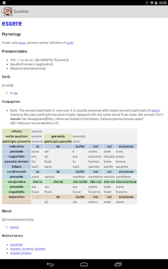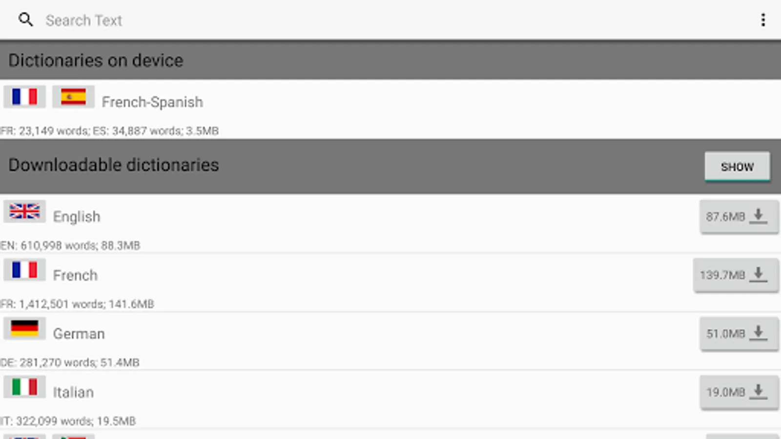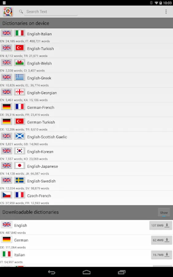 Uses data from Wiktionary to generate dictionary files that can be used offline. These can be downloaded from within the app. Both translation and single-language dictionaries available.