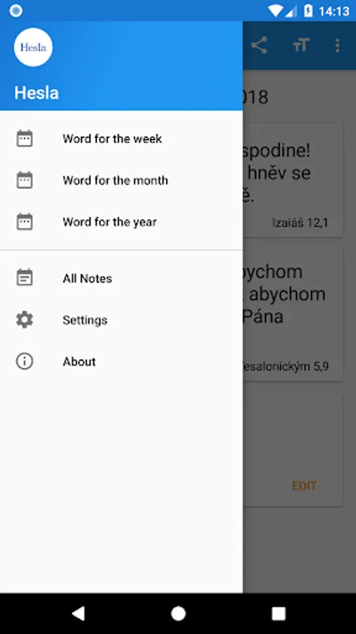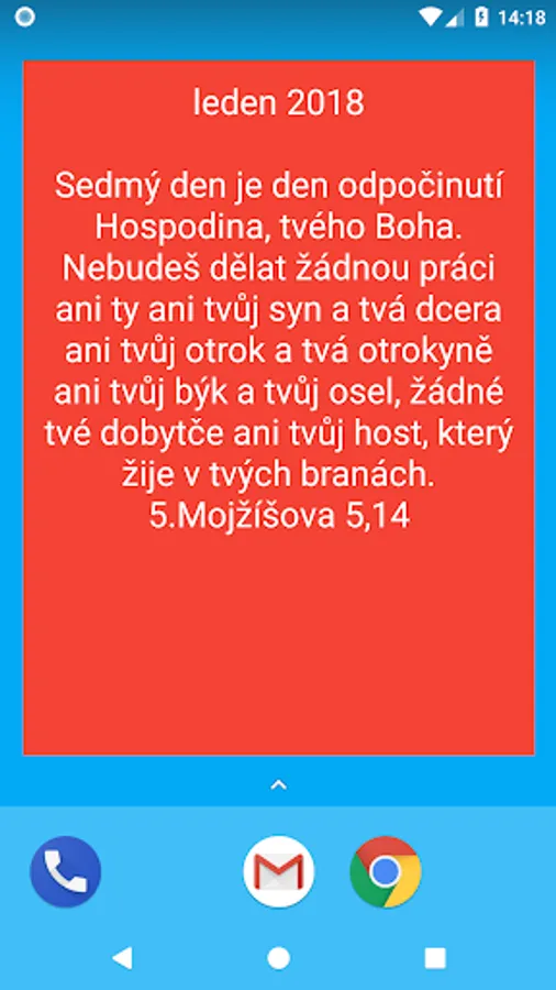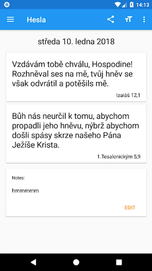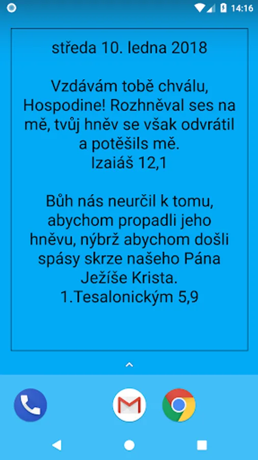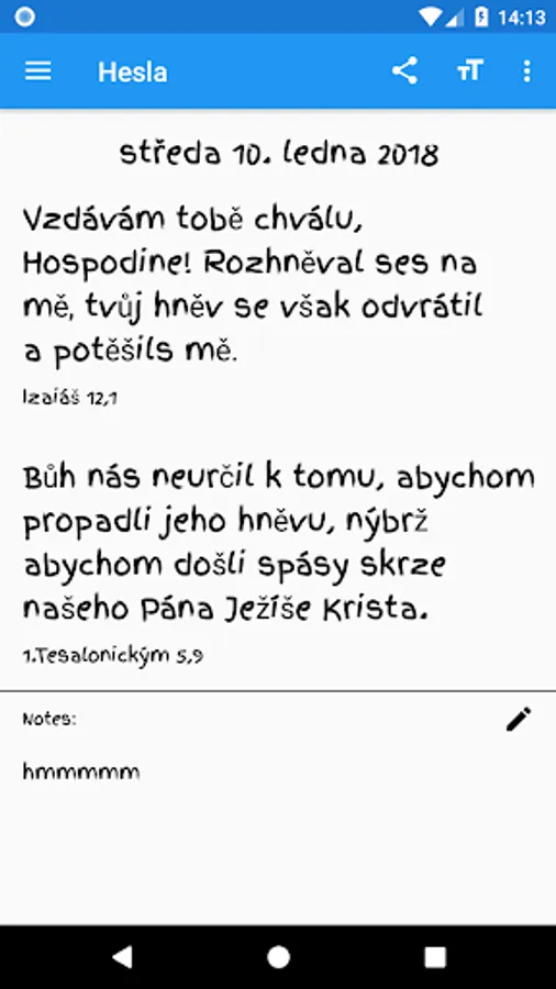 The application shows the Losungen (daily text from the bible) of the Church 'Herrnhuter Brüdergemeine' for the language Czech. Texts for the week, the month and the year can also be displayed. The application doesn't need a connection to the internet once it is downloaded.