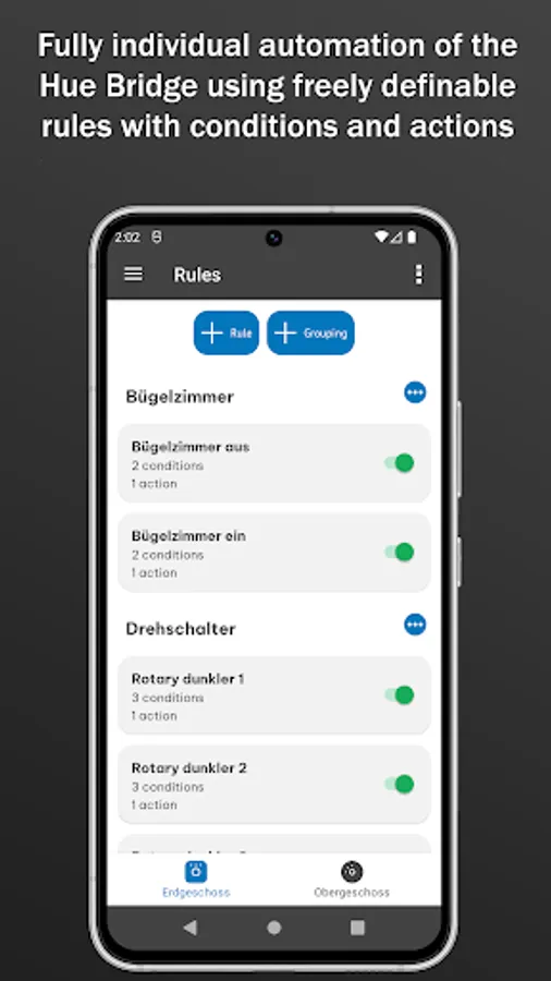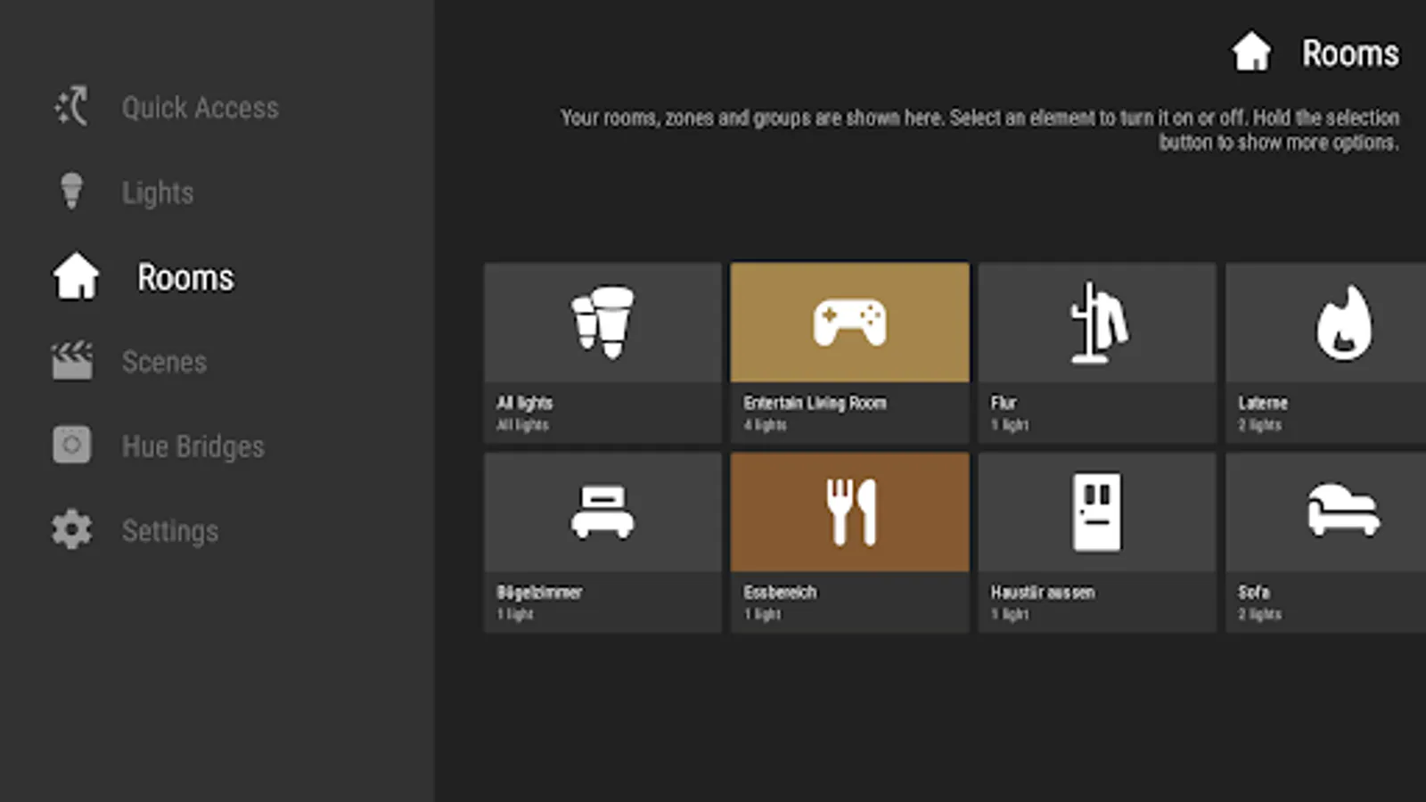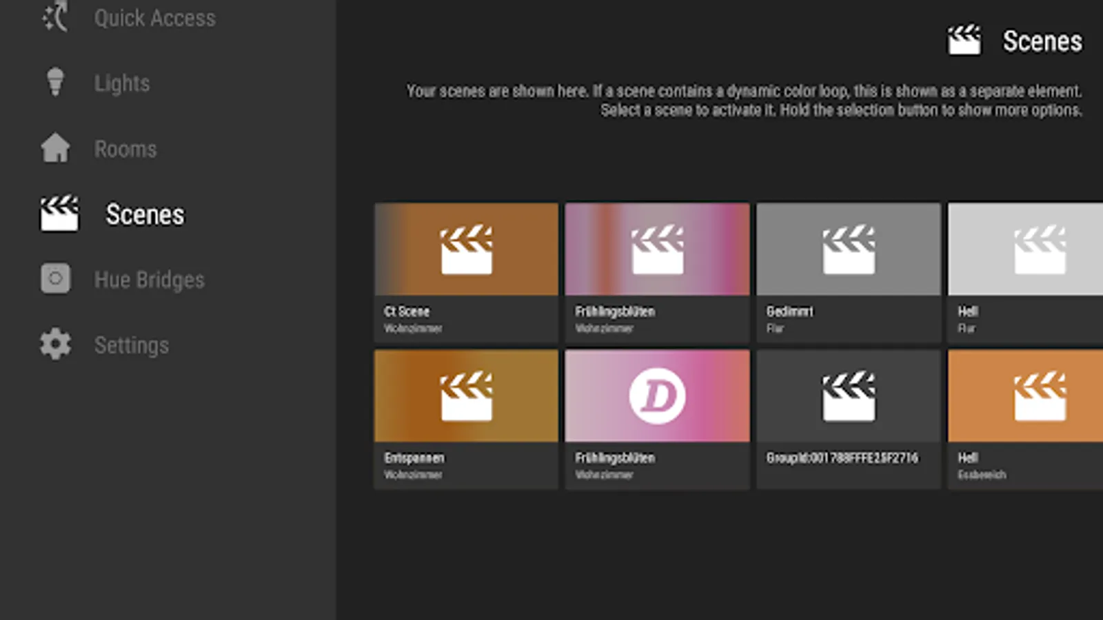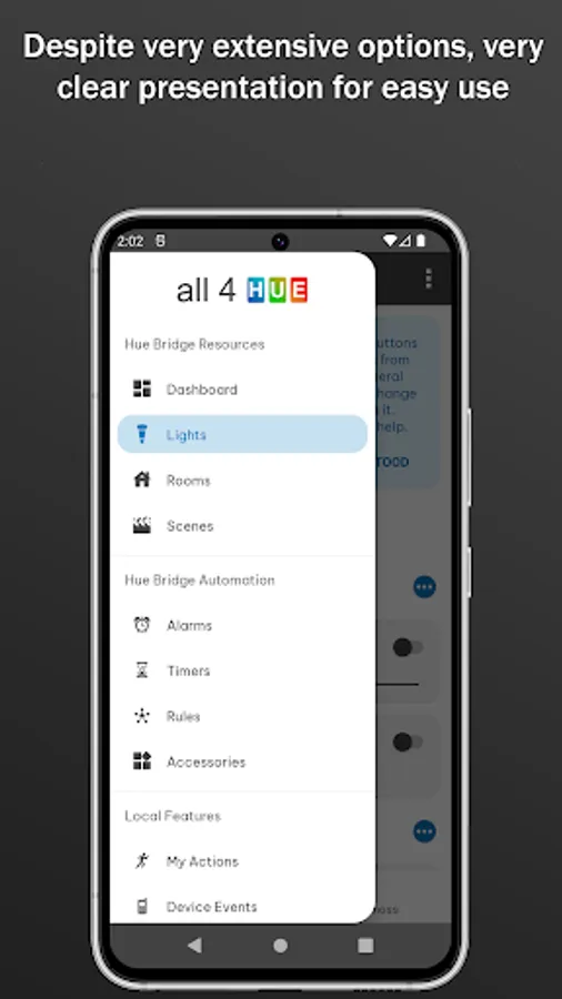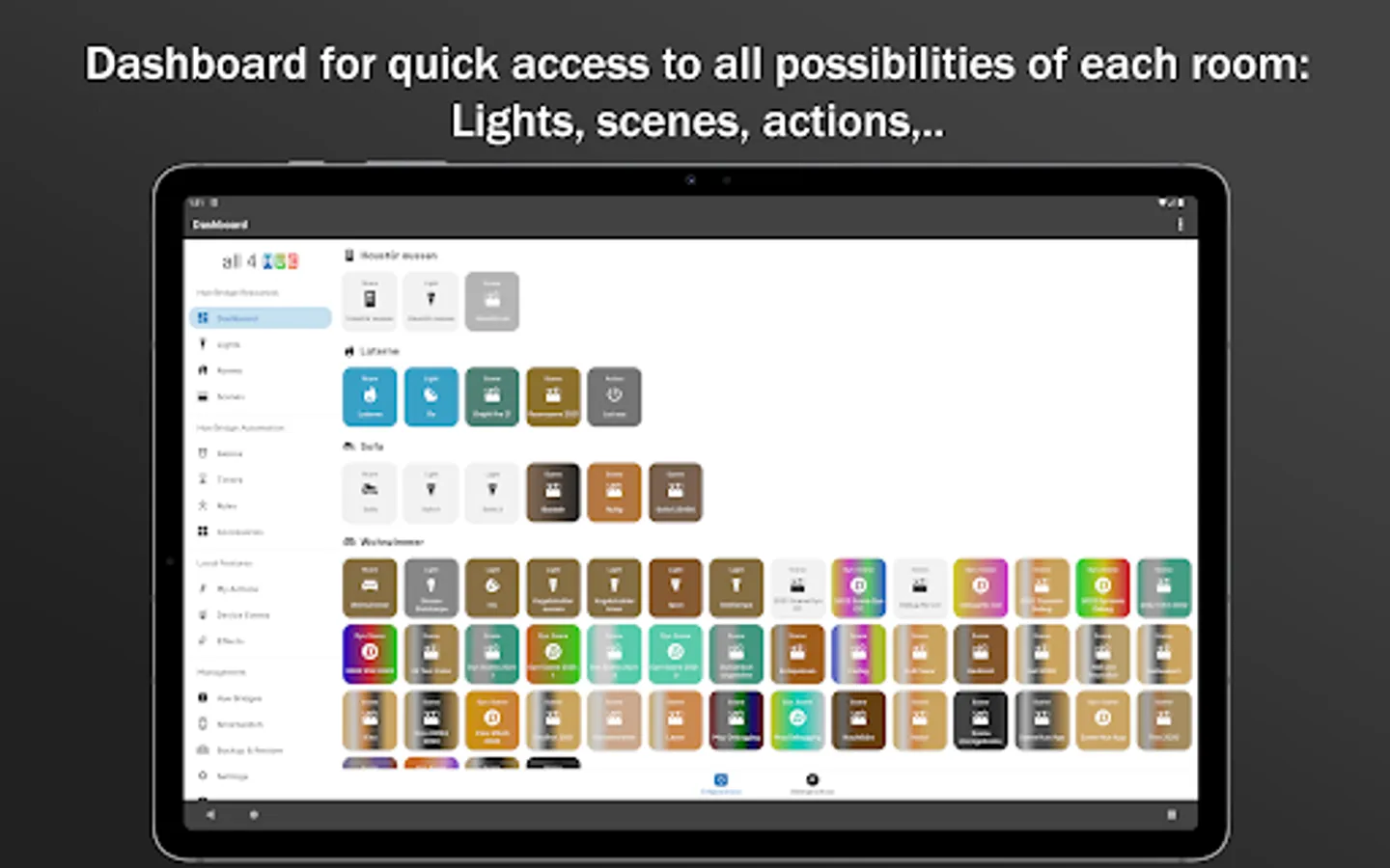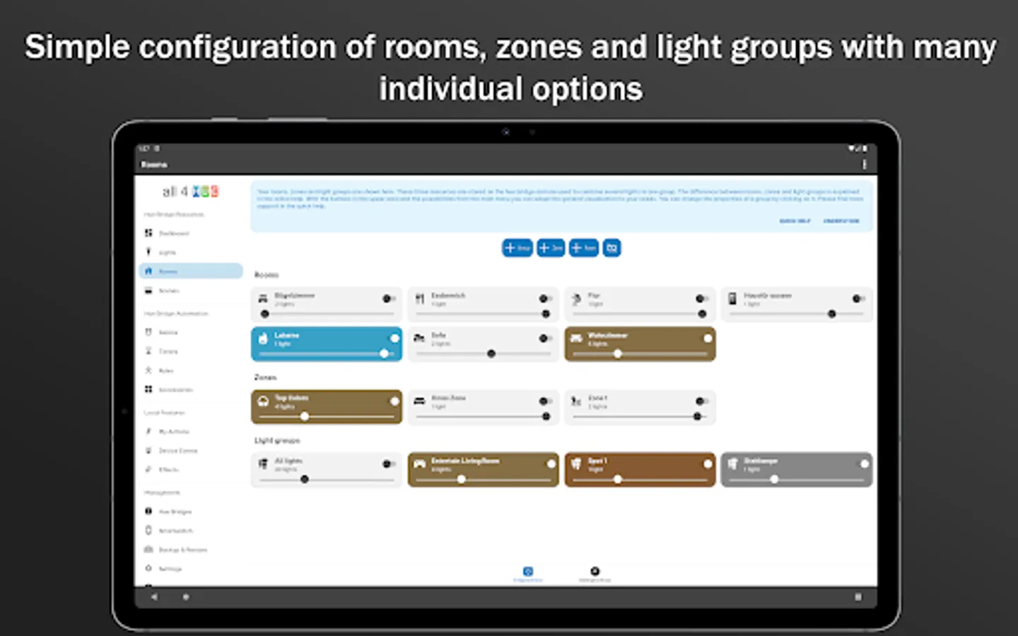 - Full support and configuration is possible of all resources on your hue bridge: Lights, groups/rooms, scenes, alarms, timers, rules, sensors.