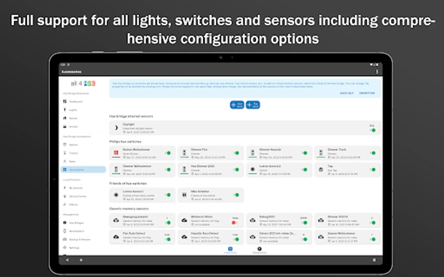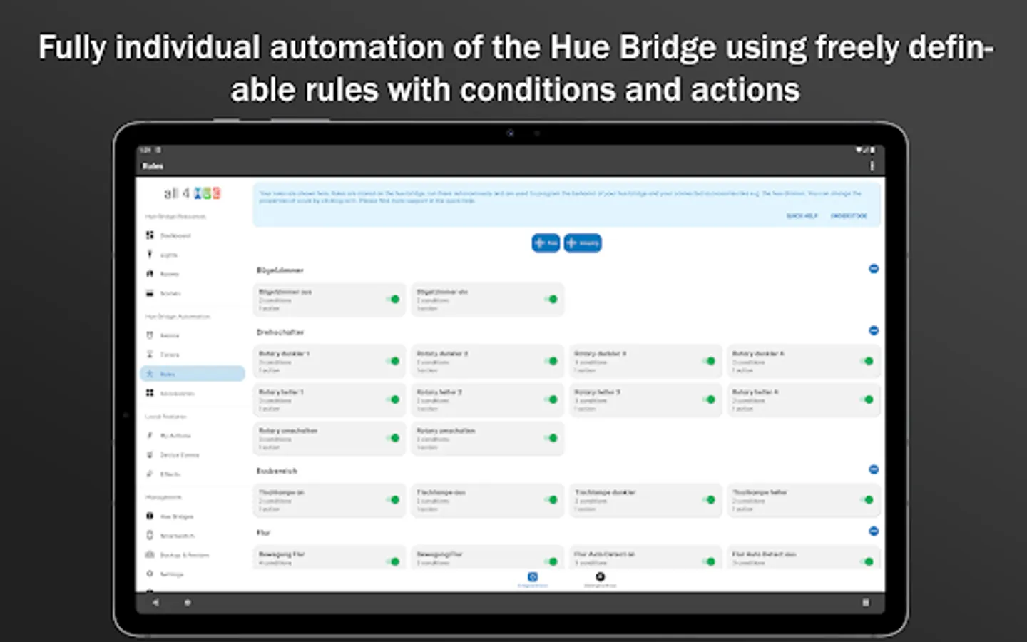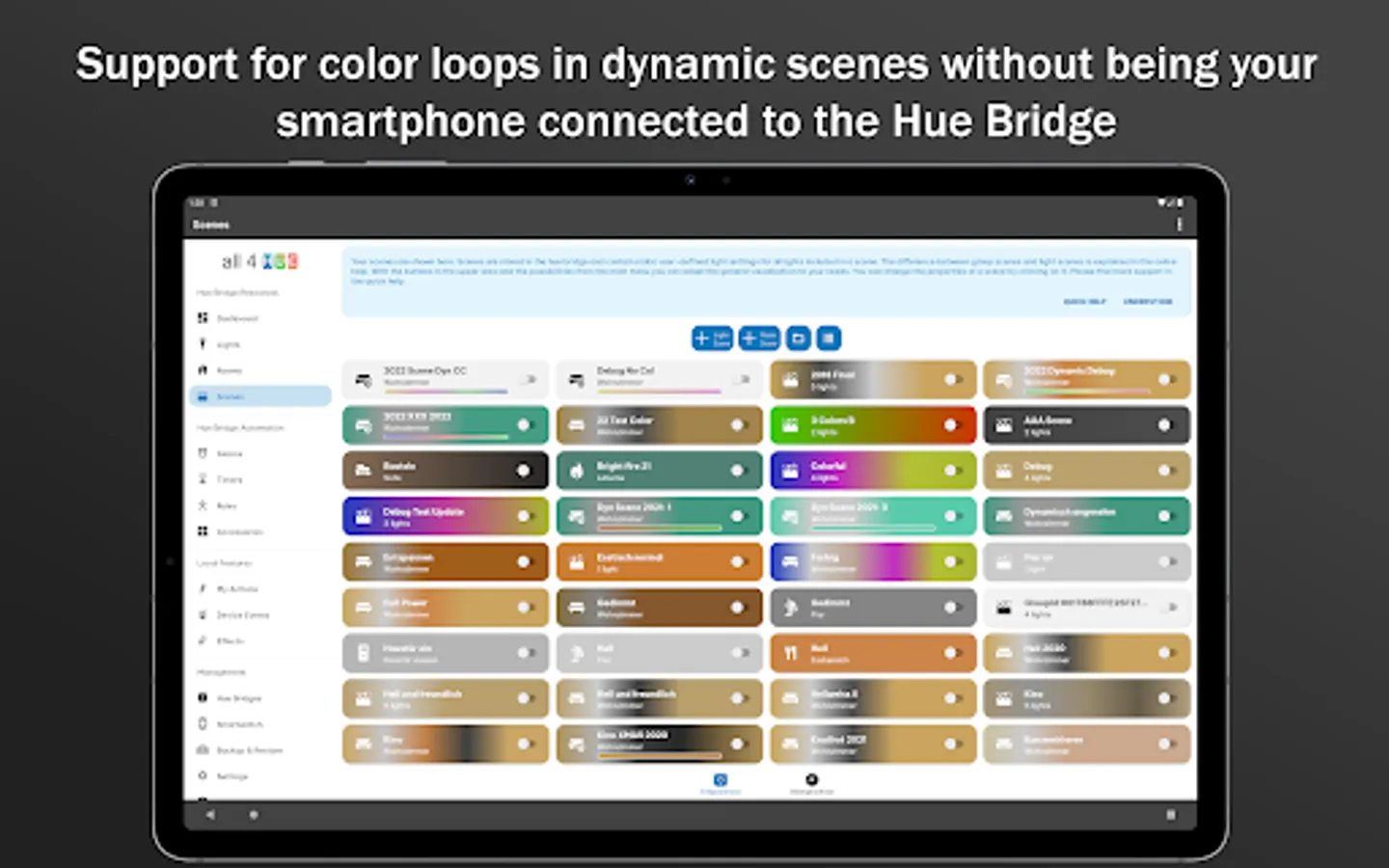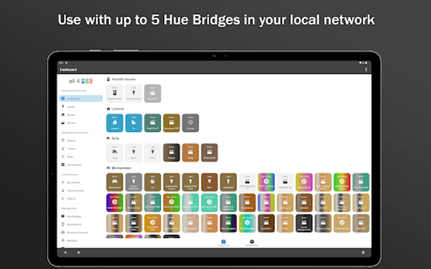 'all 4 hue' is the most sophisticated app for Philips hue. This very complete app provides much more features and stability than competing apps and is perfectly suited for the direct control of the hue bridge as well as for the full automation configuration with timers, alarms and rules in combination with all available Philips hue devices like switches and sensors. With an additional upgrade this app can be used with up to 5 hue bridges.