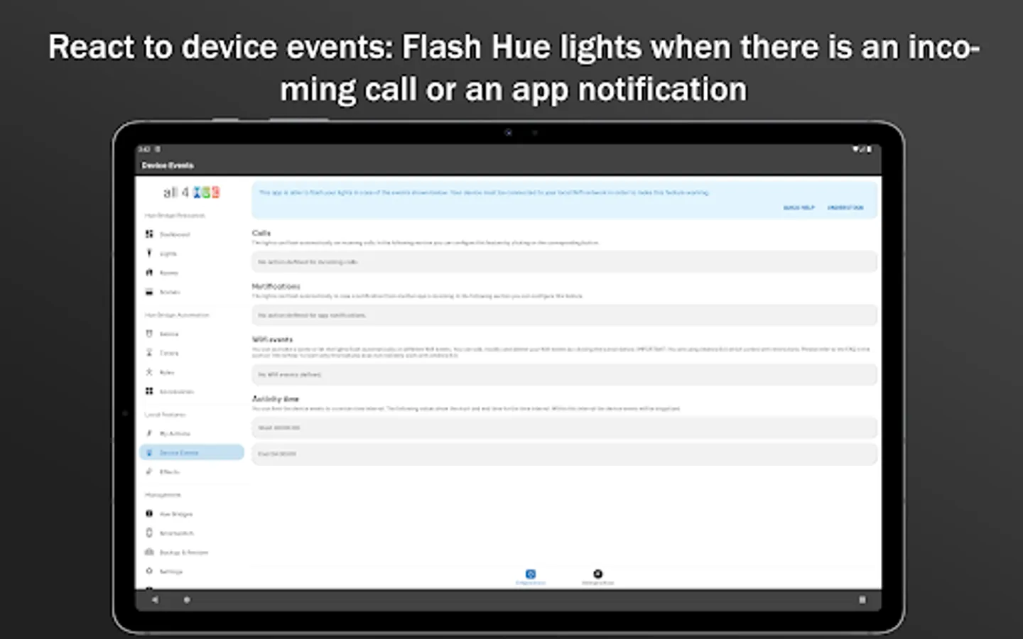 - This app can react on device events (e.g. flash lights on incoming calls).