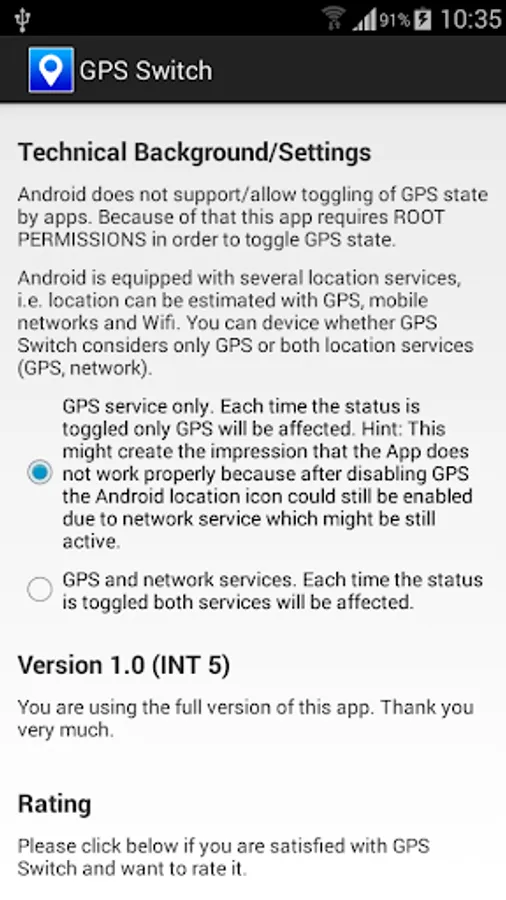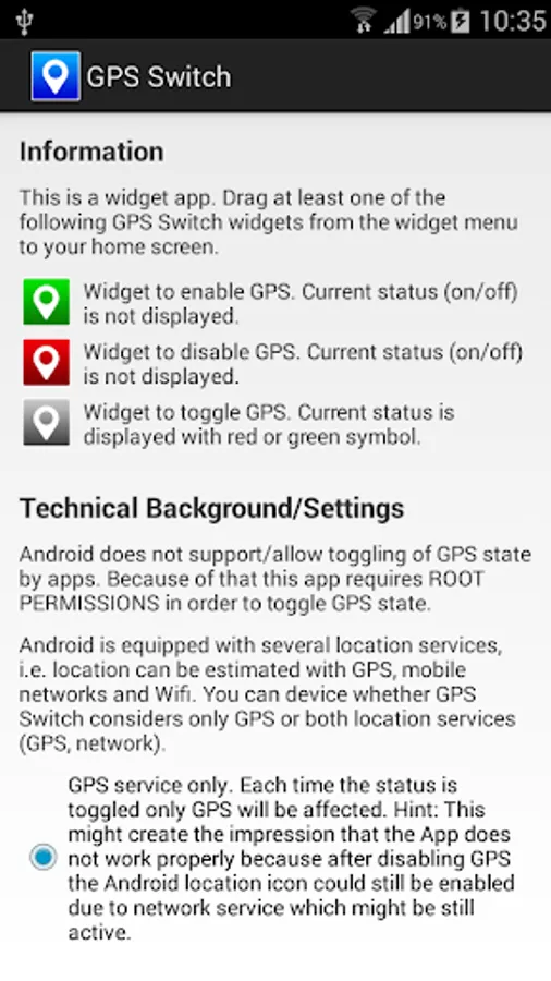 GPS Switch is an easy-to-use app which includes three widgets to enable, disable or toggle GPS status easily. Additionally not only GPS can be toggled but also mobile network location service.