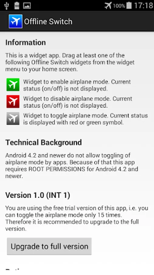 Toggling airplane mode by apps is usually not allowed/supported by Android 4.2 and newer. Therefore this app requires root permissions for Android 4.2 and newer! If you don't know what this means, please do not install this app!