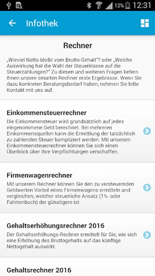 The complicated German tax law makes a controlling savings but not easy. So that you never miss an important tax information with possible consequences for your wallet, keeps our app on the fiscal developments in legislation, legal and financial management to date. It offers to monthly current posts for example,