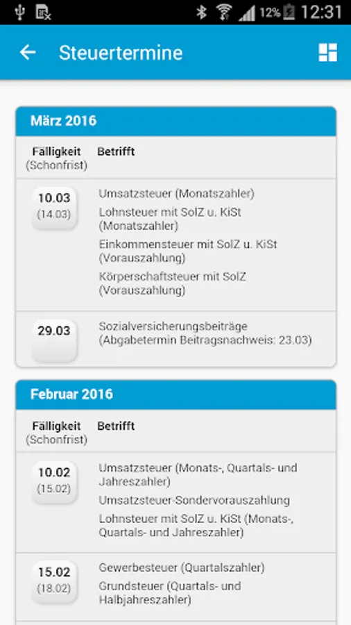 You wish to know which tax payment dates pending? Whether as Income tax or sales tax prepayment income tax or business tax - in the app you can find the corresponding dates.