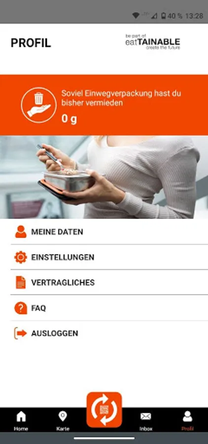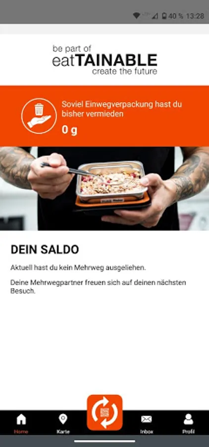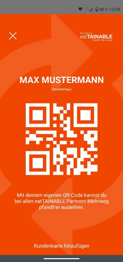 The eatTAINABLE customer app is available free of charge in the app store and gives each customer their own customer QR code. With this you can borrow reusable containers from all eatTAINABLE reusable partners without deposit. The container QR codes are simply digitally booked to the customer QR code when they are handed over.