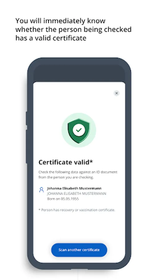 Checking Corona vaccination status, recovery from a Corona infection or a negative Corona test is the central function of the CovPassCheck app. Whenever users check the EU COVID digital certificate, only the information and data necessary for the check are displayed in the CovPassCheck app.