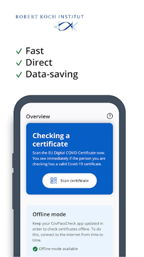 The Robert Koch Institute (RKI), as the central institution of the Federal Government in the field of public health and as the national public health institute, publishes the CovPassCheck app for the German Federal Government. With the app, the digital COVID certificates of the EU can be checked quickly and in a data-saving way. Anyone using it can find out in seconds whether the person being checked has a valid certificate. No sensitive information or data is exchanged at any time.