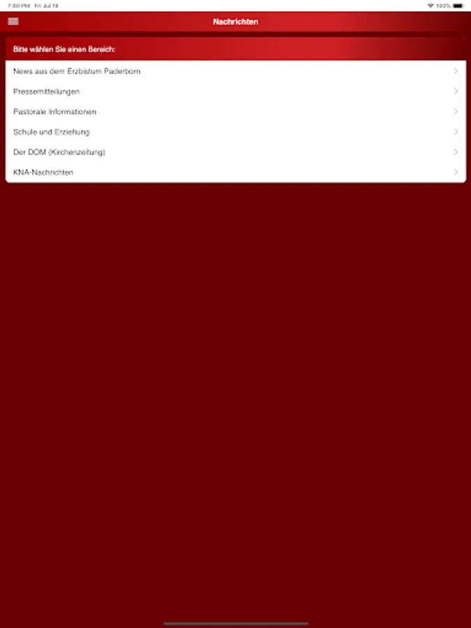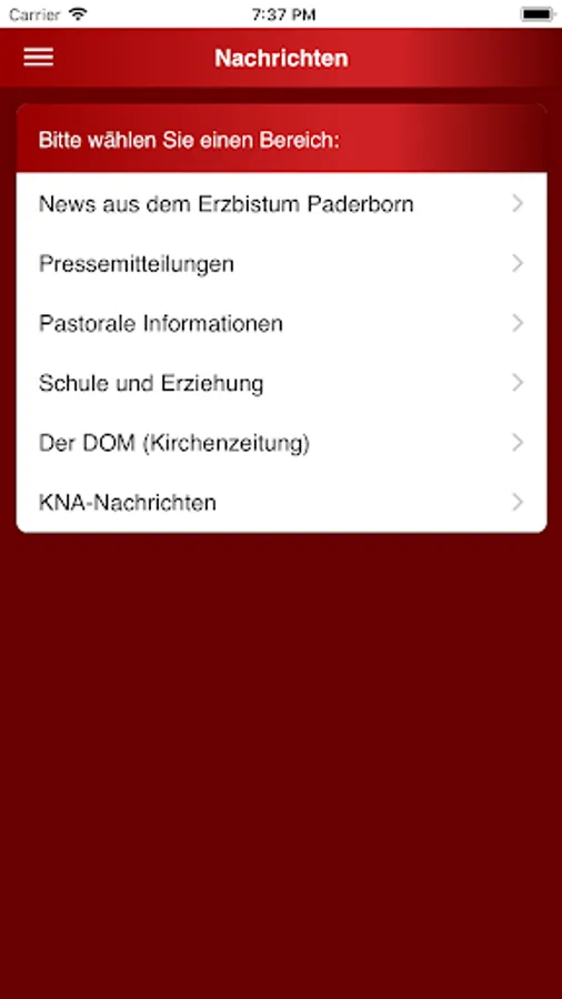 Under "News", the app brings together several news services: information from the Department of Marketing, Communications and Press Office of the Archbishopric and texts from various departments of the Archbishop's Vicariate General. As a special service, there are also news from the Catholic News Agency (KNA) and selected news from the church newspaper DER DOM.