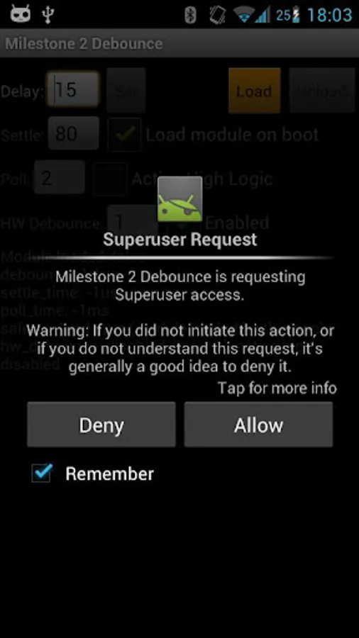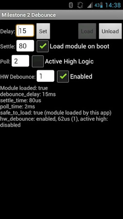 Milestone 2 Debounce tries to reduce the hardware-keyboard bouncing (double key-presses) of Motorola Milestone 2/Droid 2/Droid Pro devices by changing timeouts in the kernel keyboard-driver. To do this, it has to load an included kernel module as root. The module will only work with kernel version 2.6.32.x compiled for mapphone (Motorola Android Platform Phone). It is compatible with all Froyo- and Gingerbread-kernels (and most kernels included in CyanogenMod-Roms for later Android-versions) on the Milestone 2.