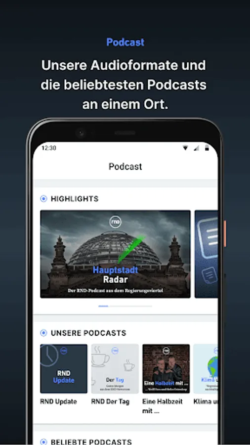 • Podcasts: Discover the whole world of podcasts. Stream our LVZ and RND originals as well as the most popular podcasts from all categories.