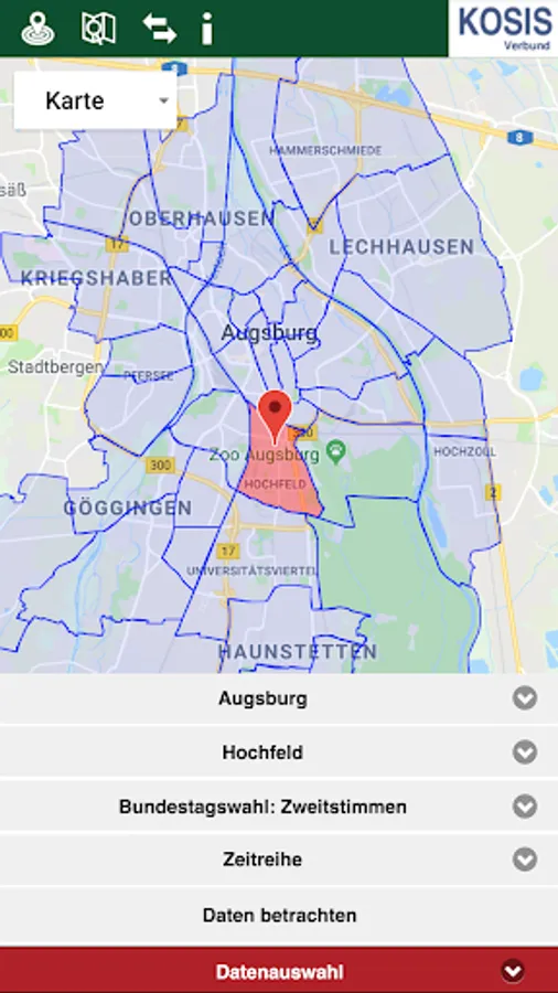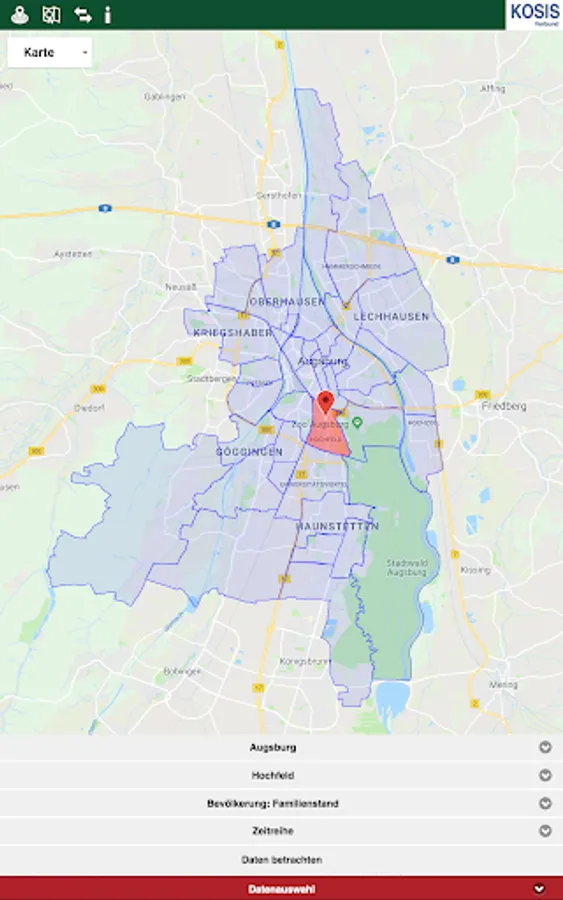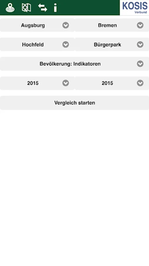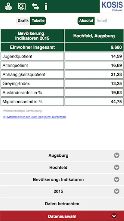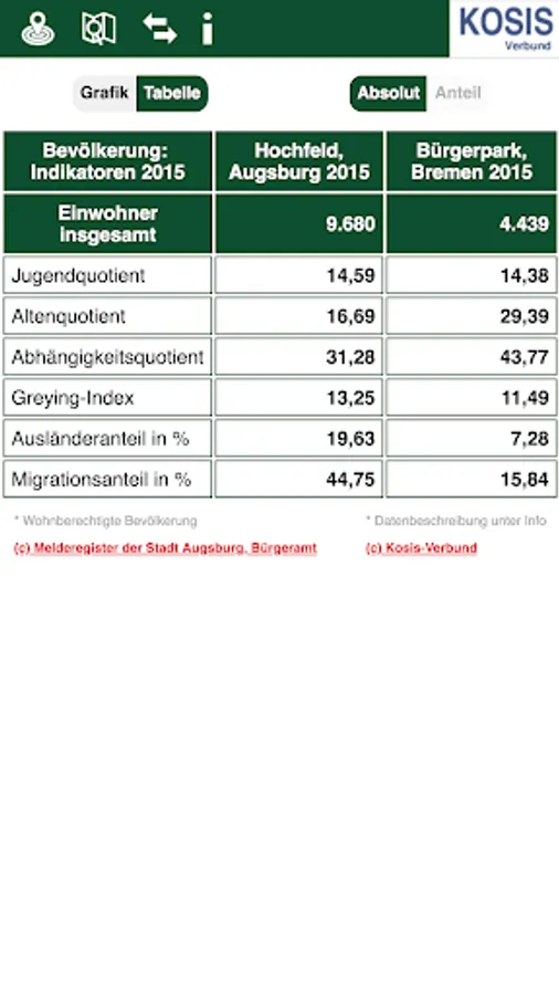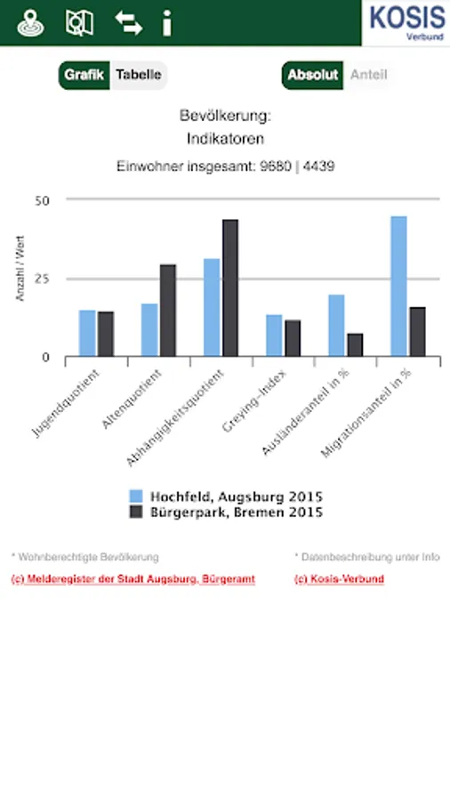 In order to include as many topics as possible for many cities in the app, the use of municipal statistics data from the comprehensive feature program of the Inner-city Space Observation (IRB), a cooperation project of the German Cities Association (DST), the Association of German Urban Statistics (VDSt), the municipal statistical information system ( KOSIS Association), the German Institute for Urban Studies (DIfU) and the Federal Institute for Research on Building, Urban Affairs and Spatial Development (BBSR). At present, 49 cities are participating in the IRB, which, with 20.1 million inhabitants in more than 2800 districts, represent about two-thirds of the German metropolitan population. The release for this small-scale statistical data must be made by the responsible municipal statistics office.