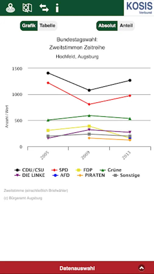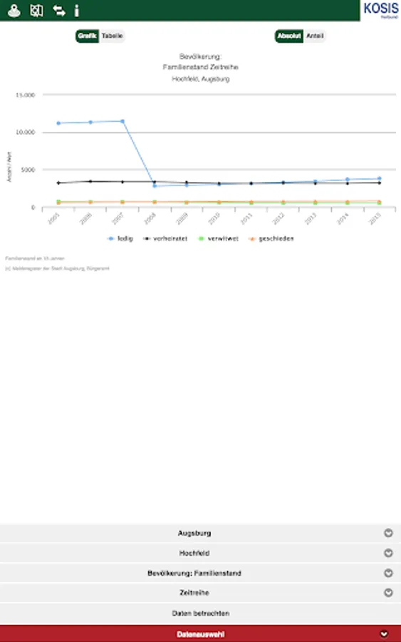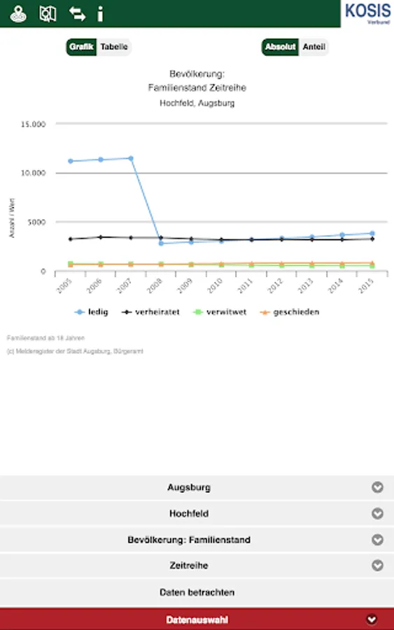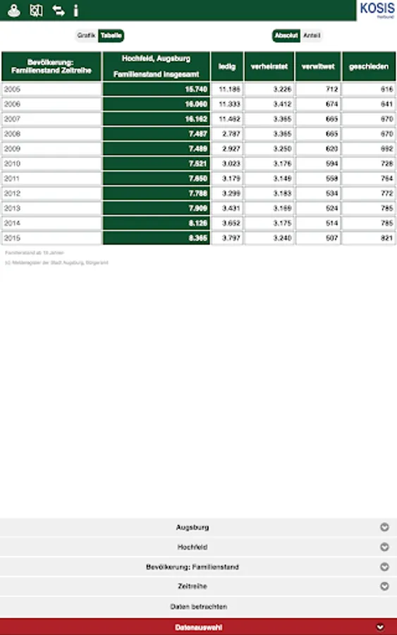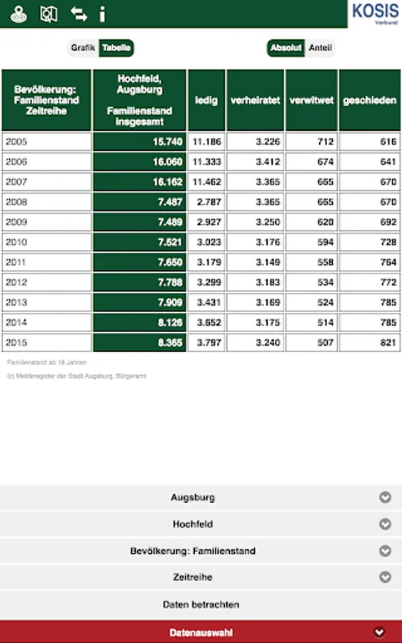 The prototype of this application was developed by the Office of Statistics and Urban Research in cooperation with a project group of the Augsburg University of Applied Sciences, which received the 1st place in the category "Interactive Visualizations and Apps" from the international project Year of Statistics. The further development is carried out by the KOSIS community "Mobile application for the representation of small-scale statistics (KOSIS app)".